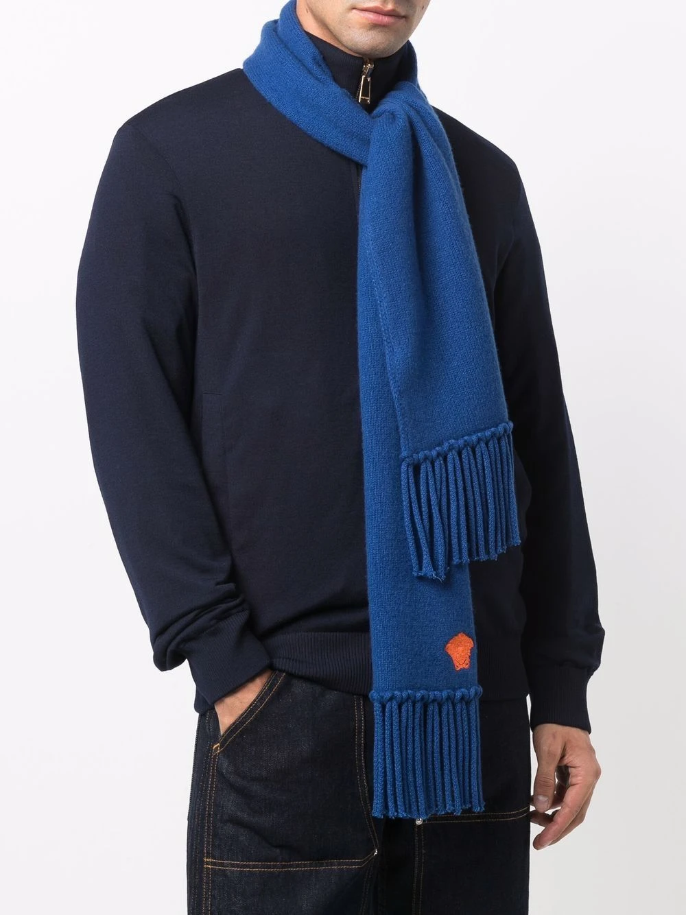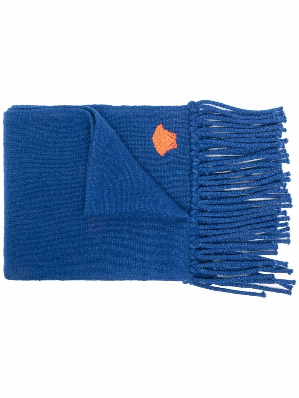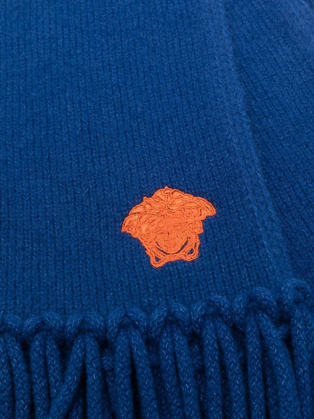 Motif Medusa, broderies, bordure à franges. Couleur : bleu. Matière : cachemire.