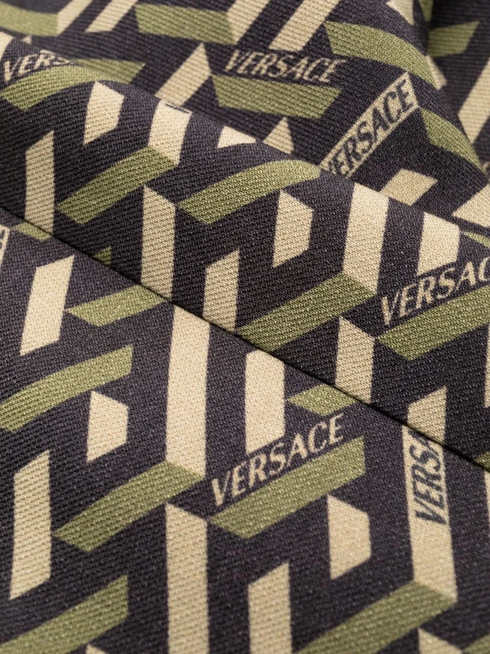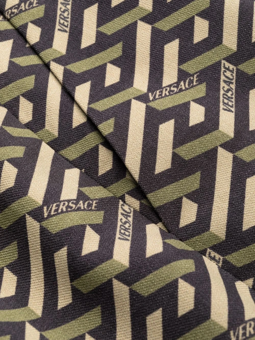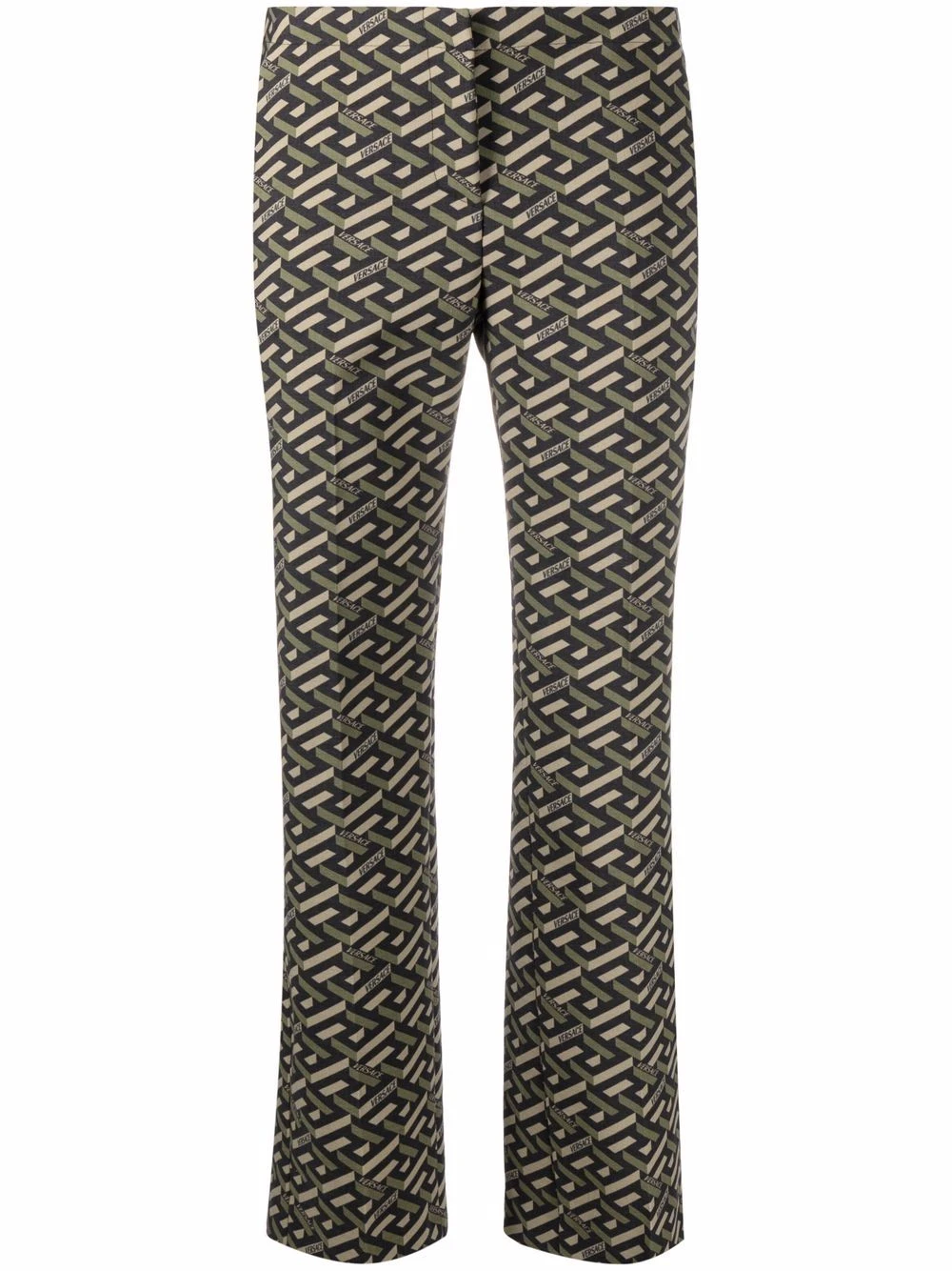 Motif Greca signature imprimé, longueur crop, fermeture dissimulée sur le devant, poches latérales fendues.