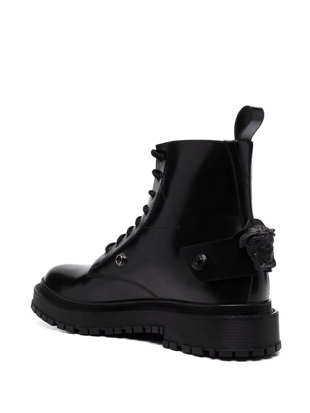 Motif Medusa, design ton sur ton, hauteur cheville, languette d’enfilage au talon, bout rond, fermeture à lacer sur le devant, semelle en caoutchouc. Couleur : noir. Matière : cuir.