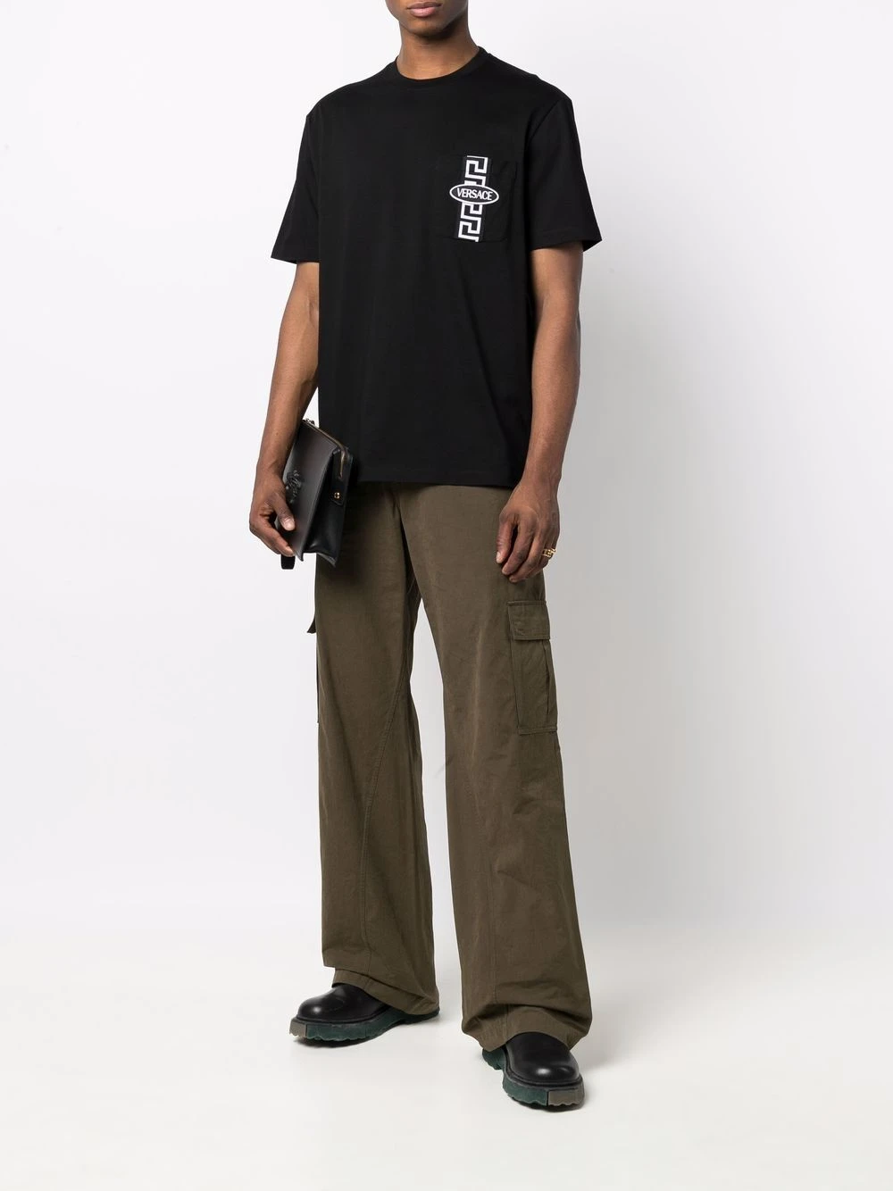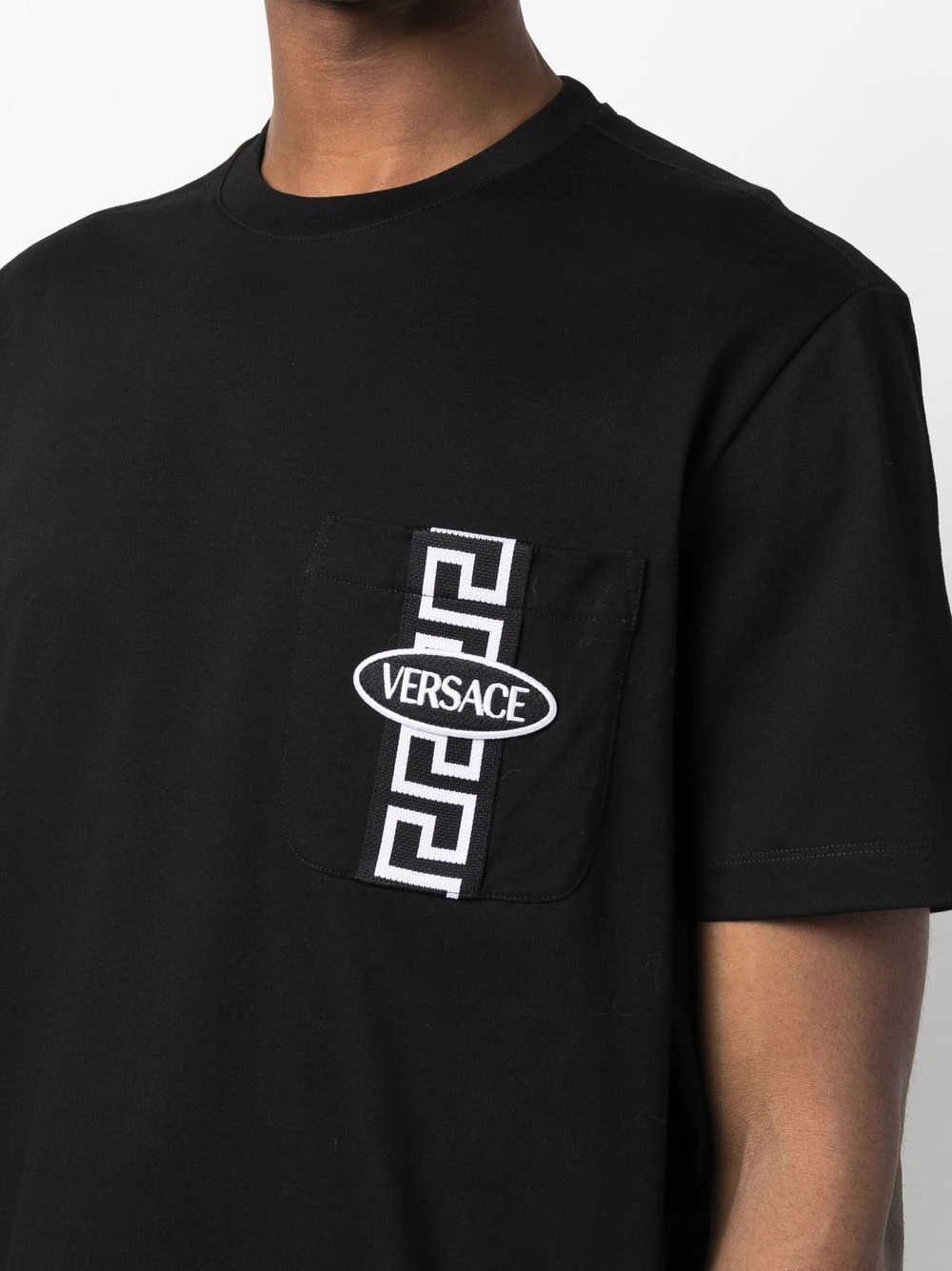 Logo imprimé à la poitrine, détail Greca signature, encolure ronde, manches courtes, ourlet droit. Couleur : noir. Matière : coton.