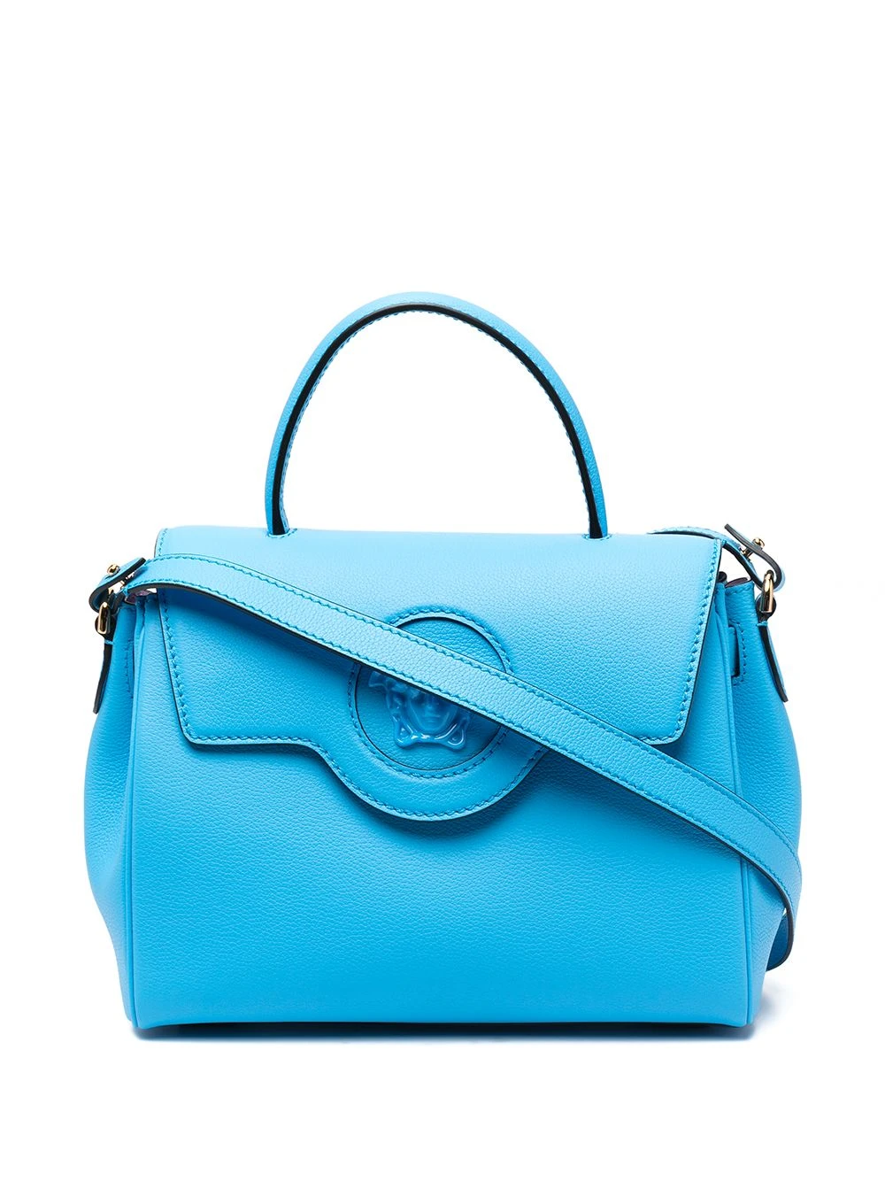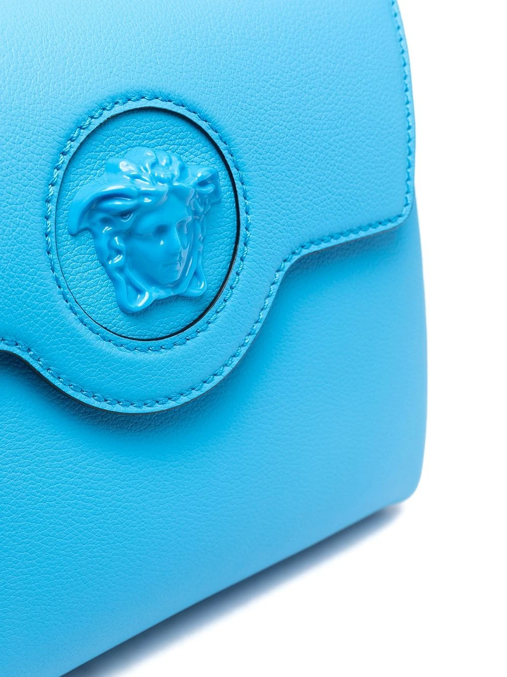 Fini mat, anse arrondie, bride portée épaule en chaîne, bride portée épaule ajustable, logo imprimé à l’arrière, rabat sur le dessus à fermeture magnétique, poche intérieure zippée. Couleur : Bleu. Matière : cuir.