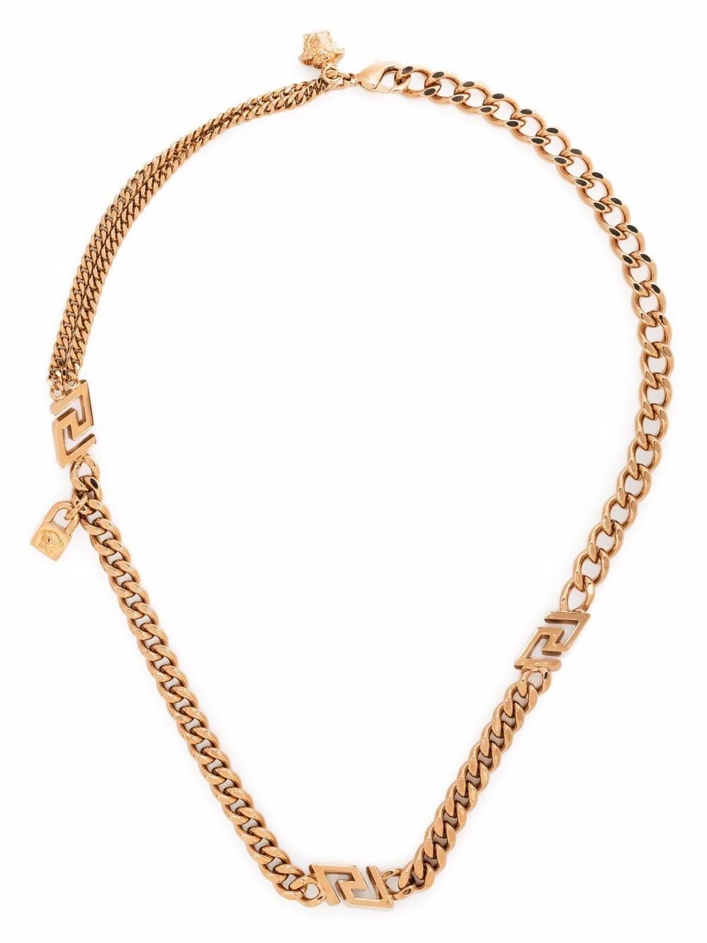 Maille gourmette, détail Greca signature, motif Medusa, détail de breloque, fermoir mousqueton. Matière : laiton.