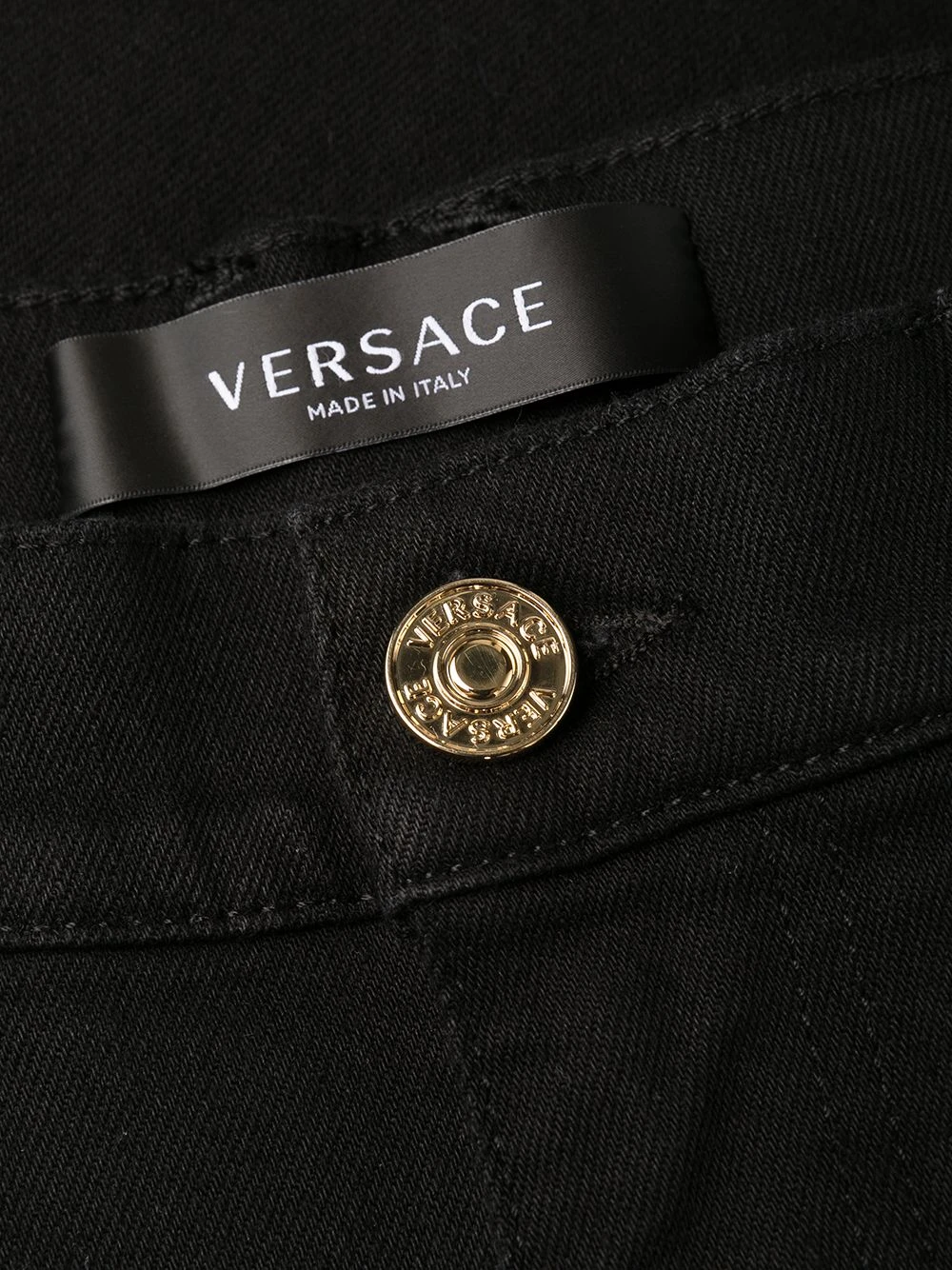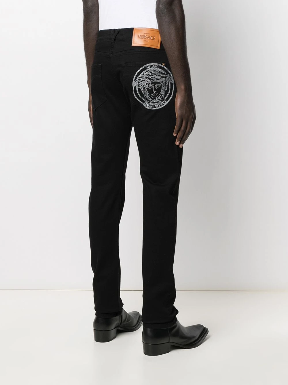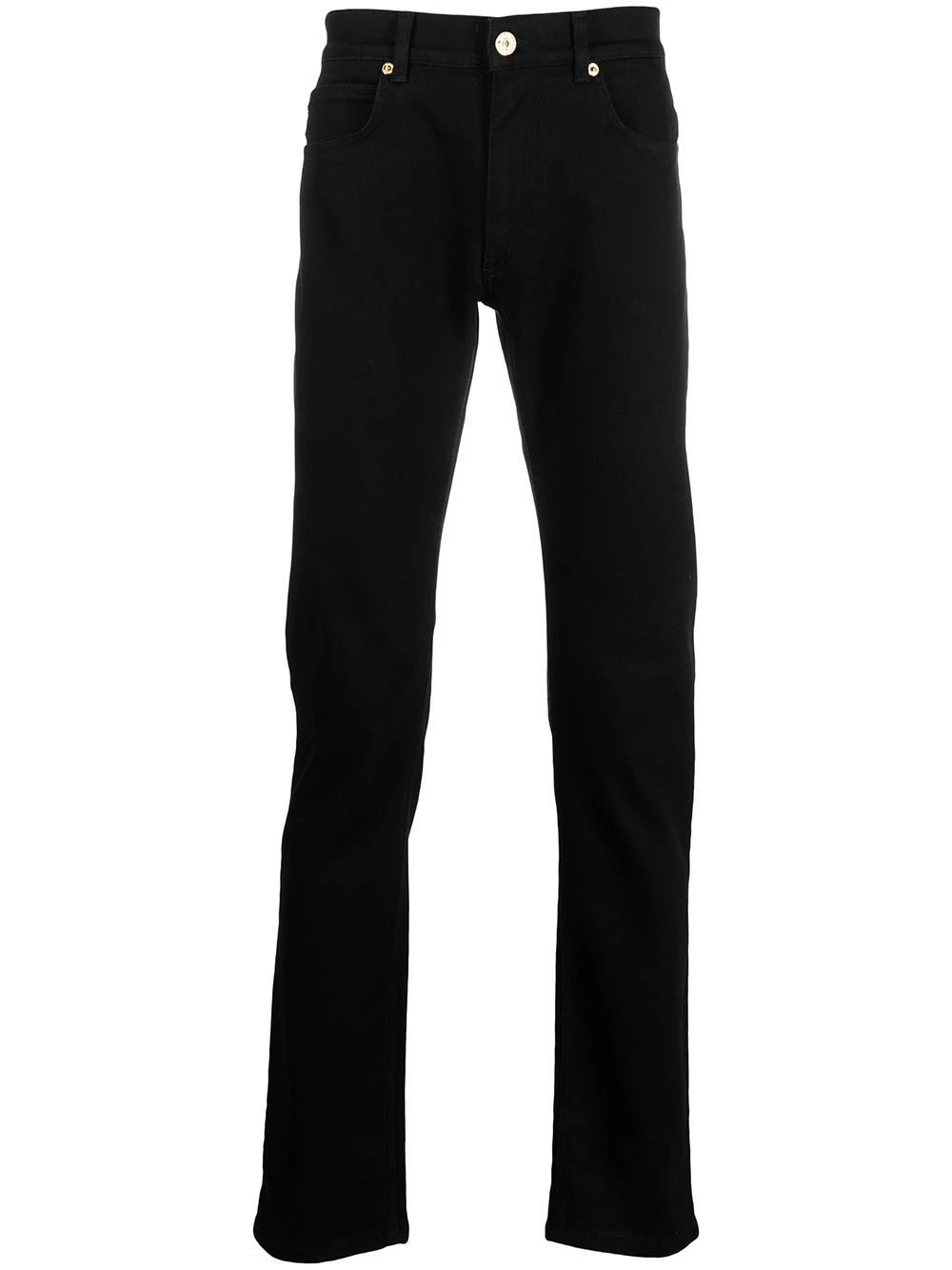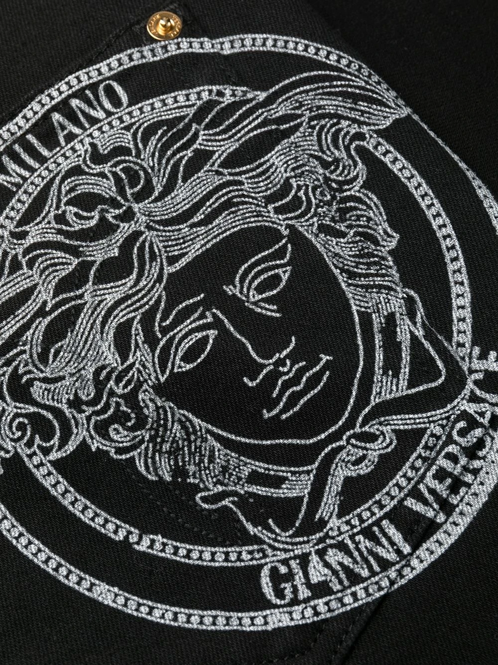 Motif Medusa, patch logo embossé sur l’arrière, coupe slim, fermeture à zip et boutons sur le devant, passants de ceinture, 5 poches classiques. Couleur : noir.