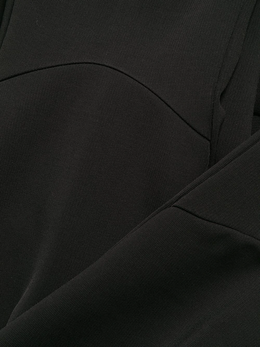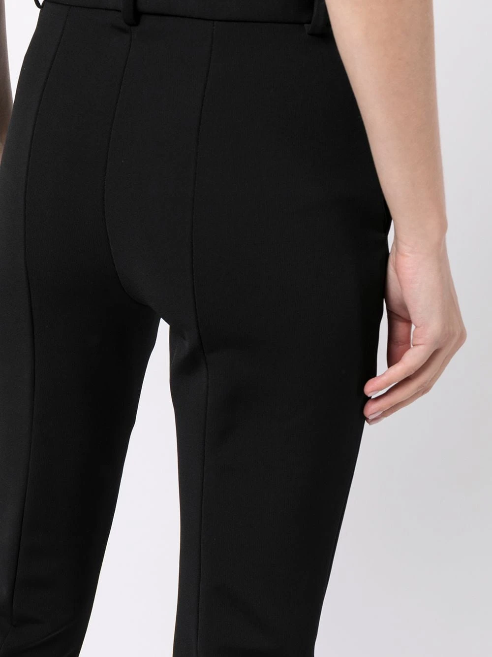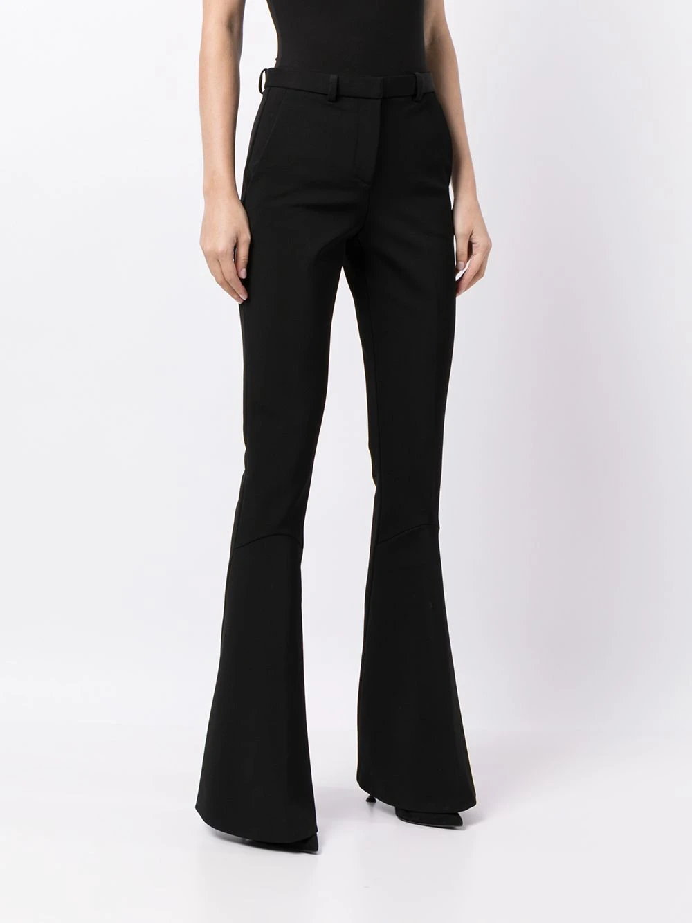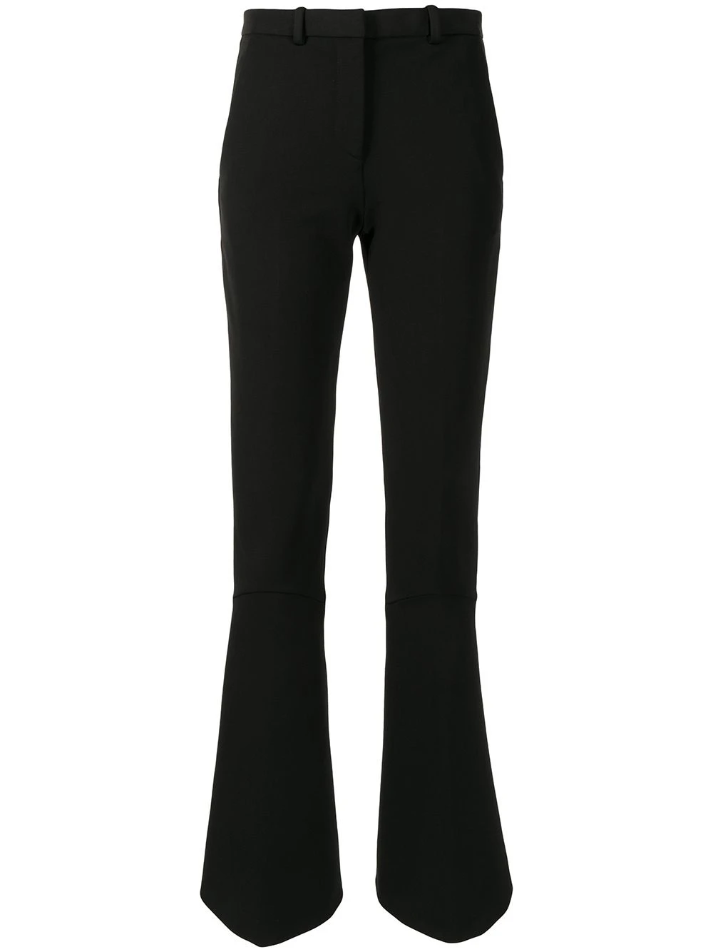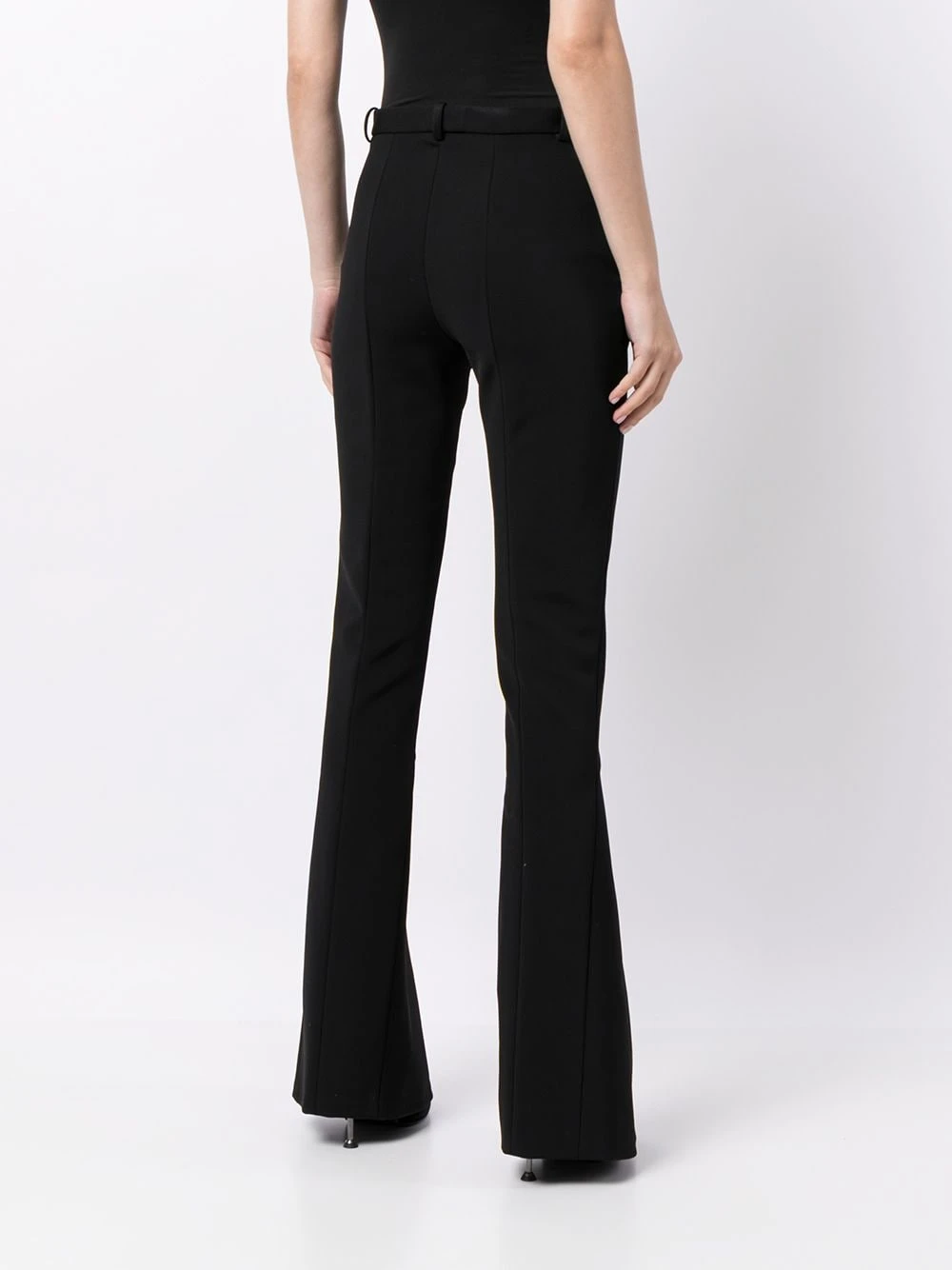 Coupe classique, passants de ceinture, fermeture à zip et agrafes, coupe évasée, poches latérales fendues. Couleur : noir.