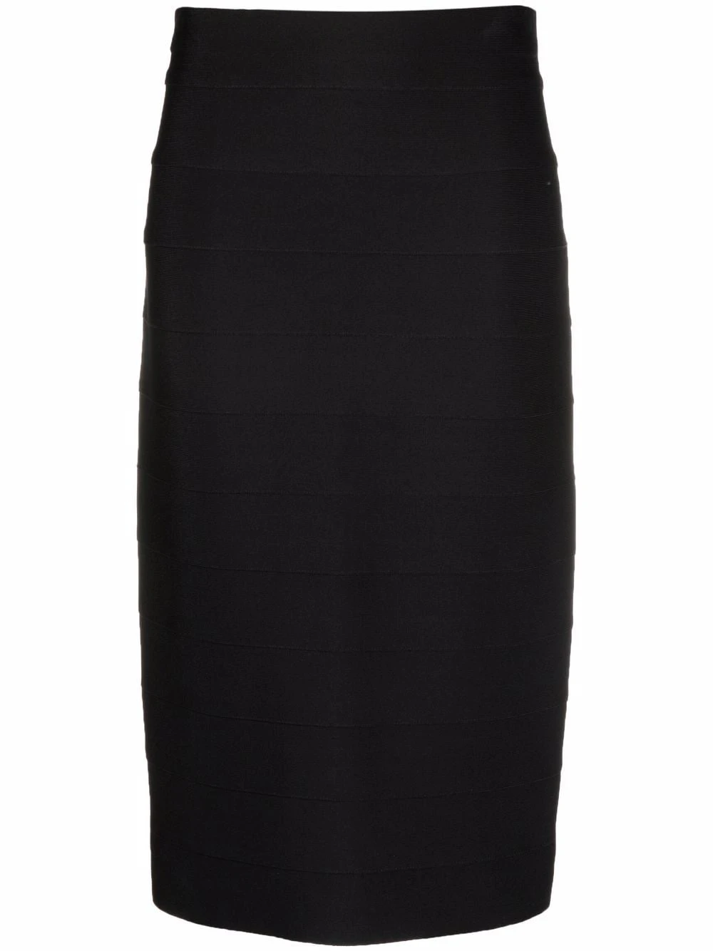 Taille haute, fermeture zippée à l’arrière, coupe mi-longue, construction stretch. Couleur : noir.