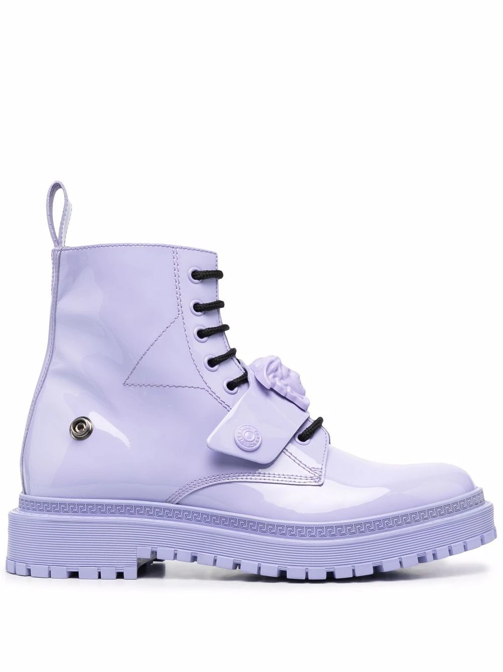 Détail Medusa, fermeture à lacer sur le devant, languette d’enfilage au talon, bout rond, semelle épaisse crantée en caoutchouc.