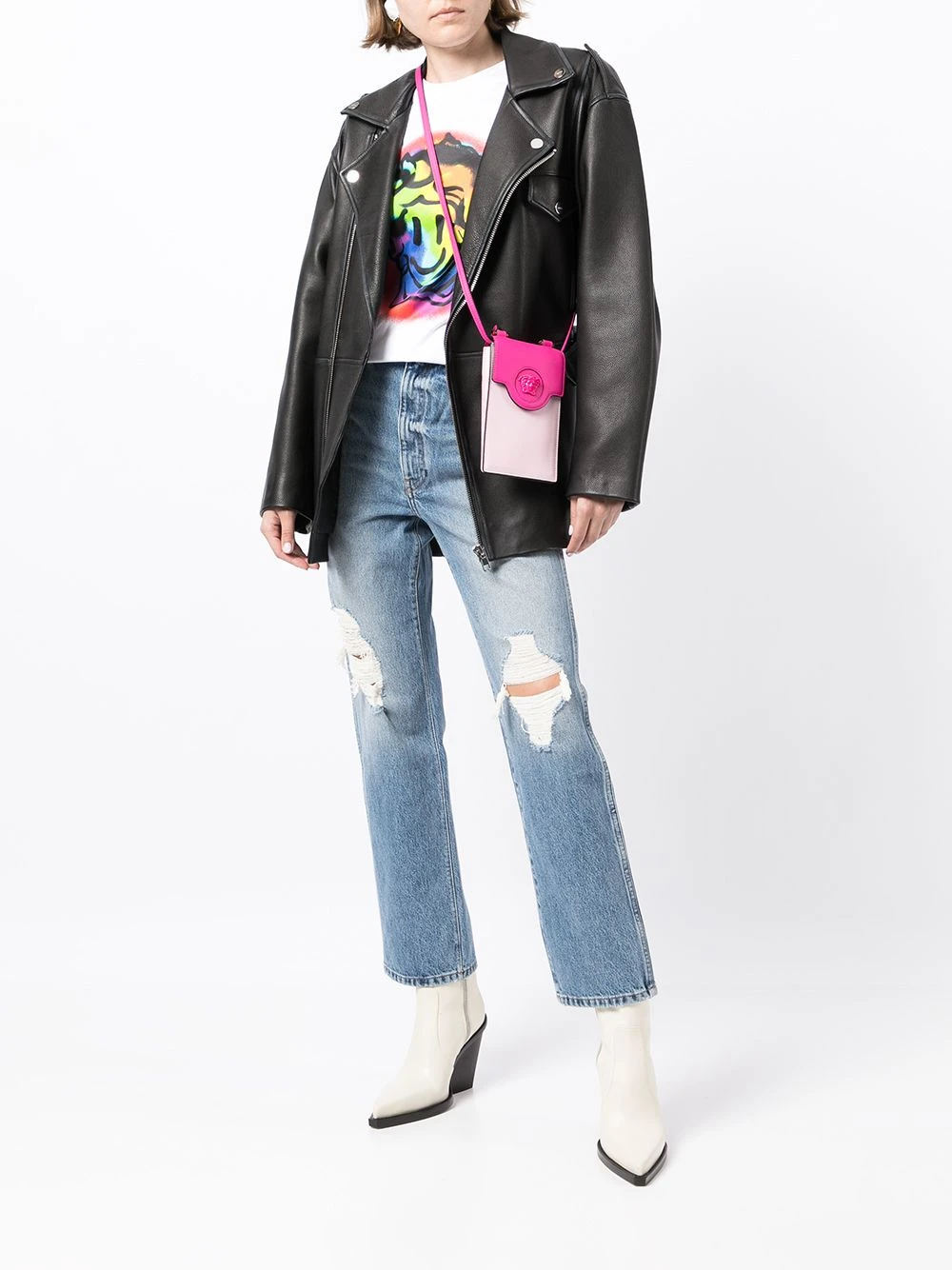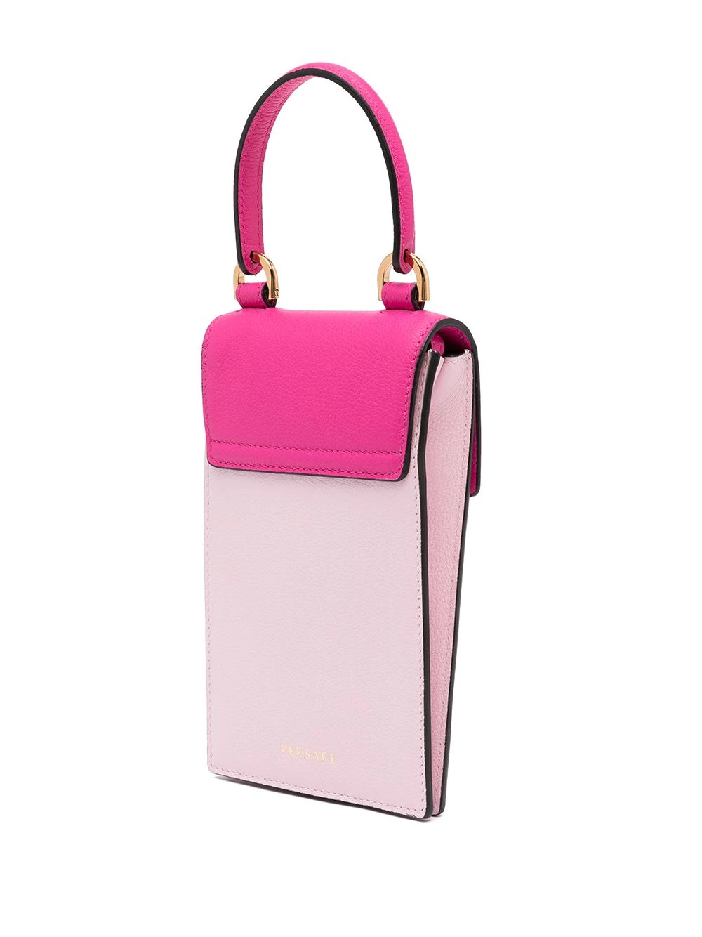 Motif Medusa, modèle bicolore, fermeture à boutons pression, bride porté épaule détachable et ajustable. Matière : cuir.