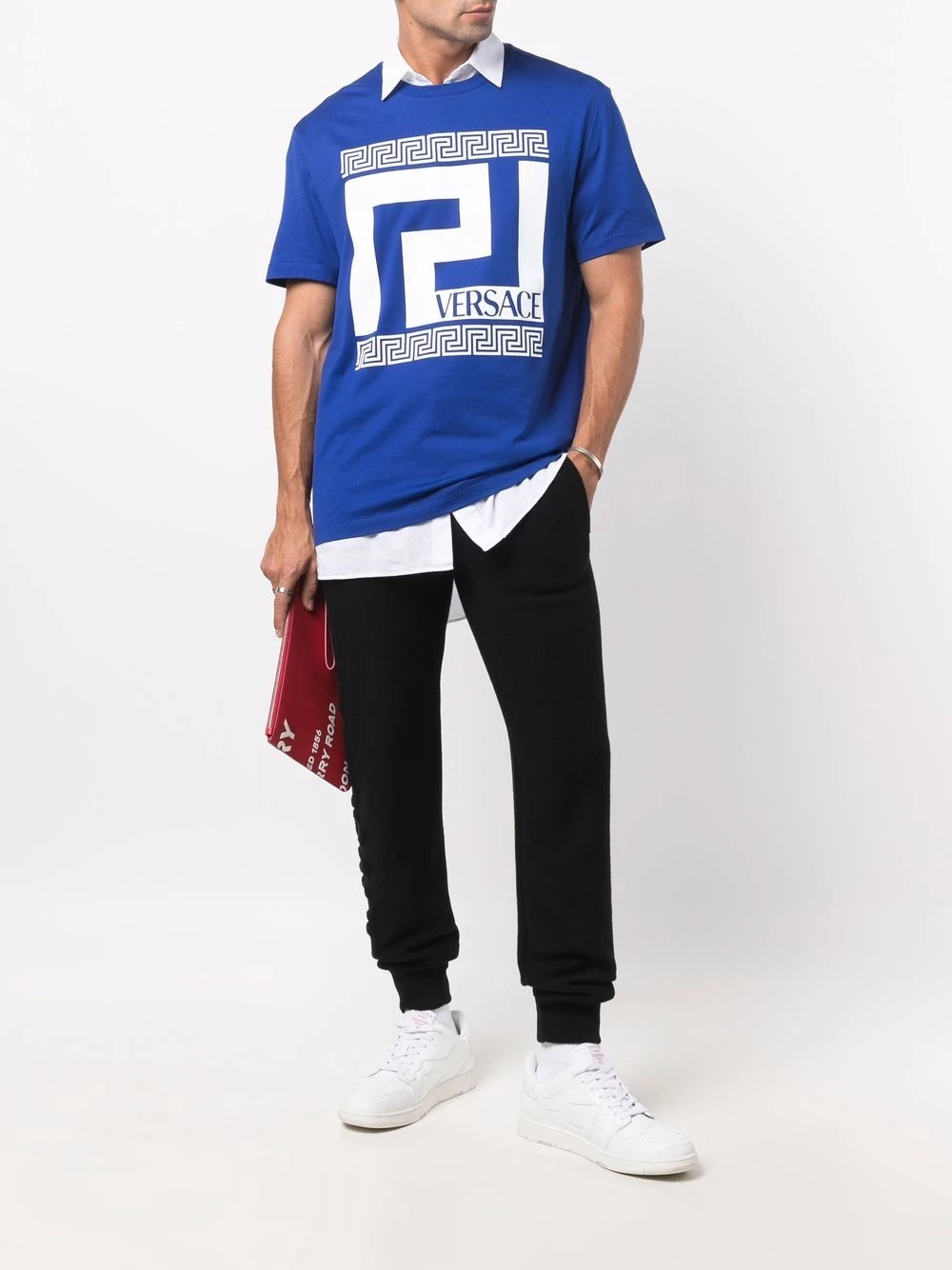 Logo imprimé sur le devant, motif Greca signature imprimé, encolure ronde, manches courtes, ourlet droit. Couleur : bleu. Matière : coton.