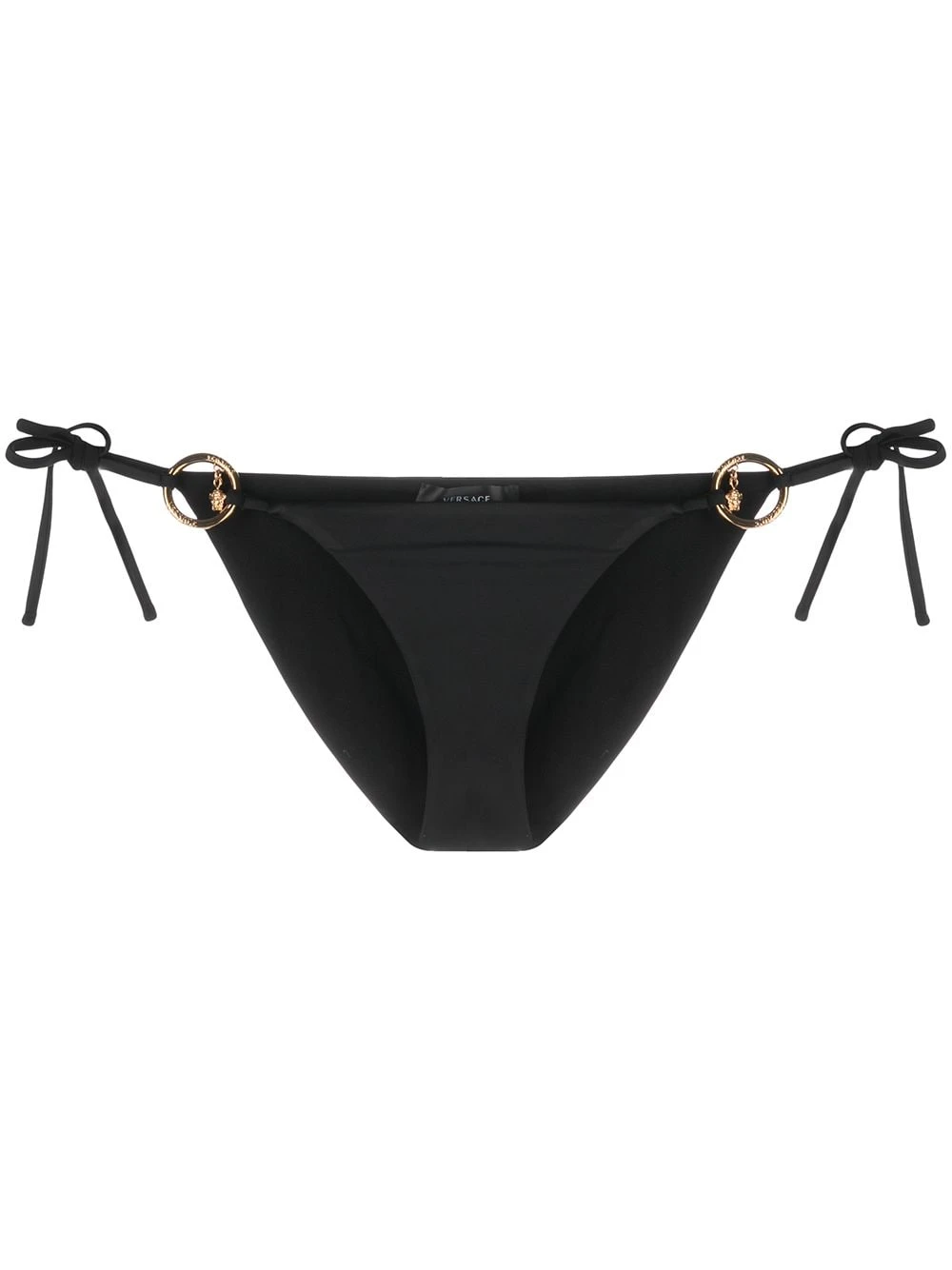 Détail Medusa, fermeture à nouer sur les côtés, taille basse. Couleur : noir. Veillez à essayer les maillots de bain par-dessus vos sous-vêtements.