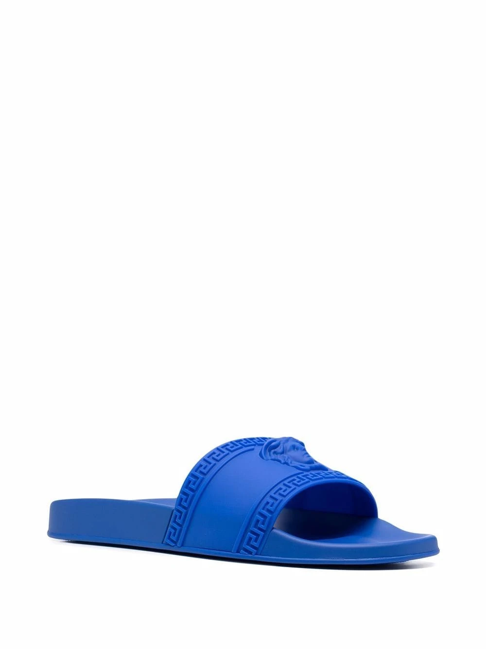 Motif Medusa, bout ouvert, semelle plate. Matière : caoutchouc.