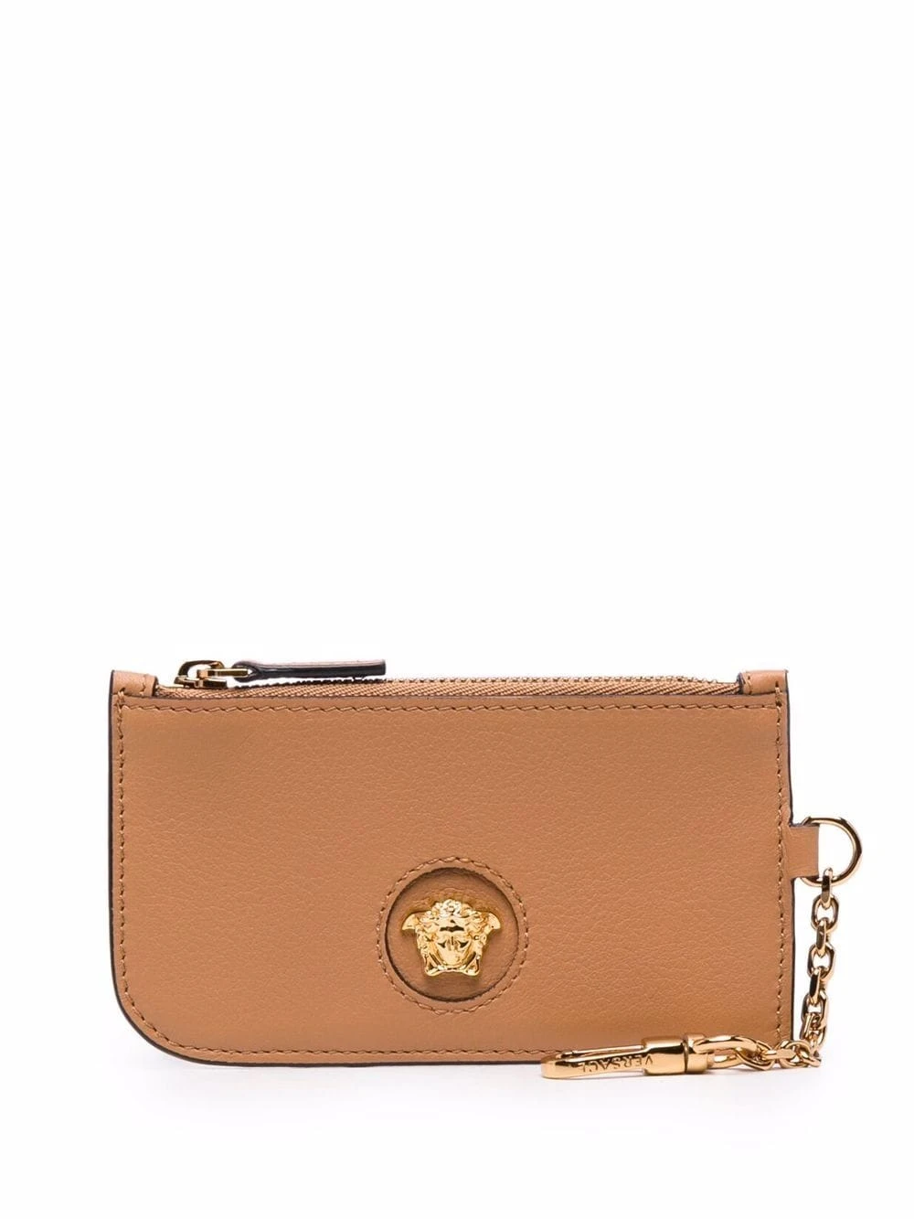 DĂ©tail Medusa, logo imprimĂ© Ă l’arriĂšre, finitions en mĂ©tal dorĂ©, fentes pour carte, fermeture zippĂ©e sur le dessus, fermoir mousqueton. MatiĂšre : cuir.