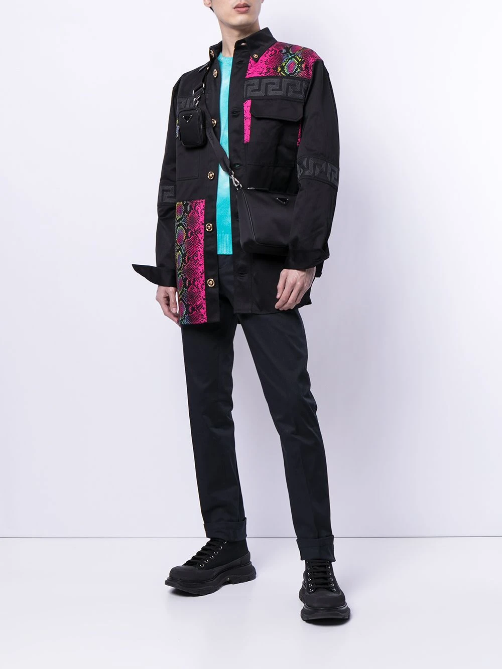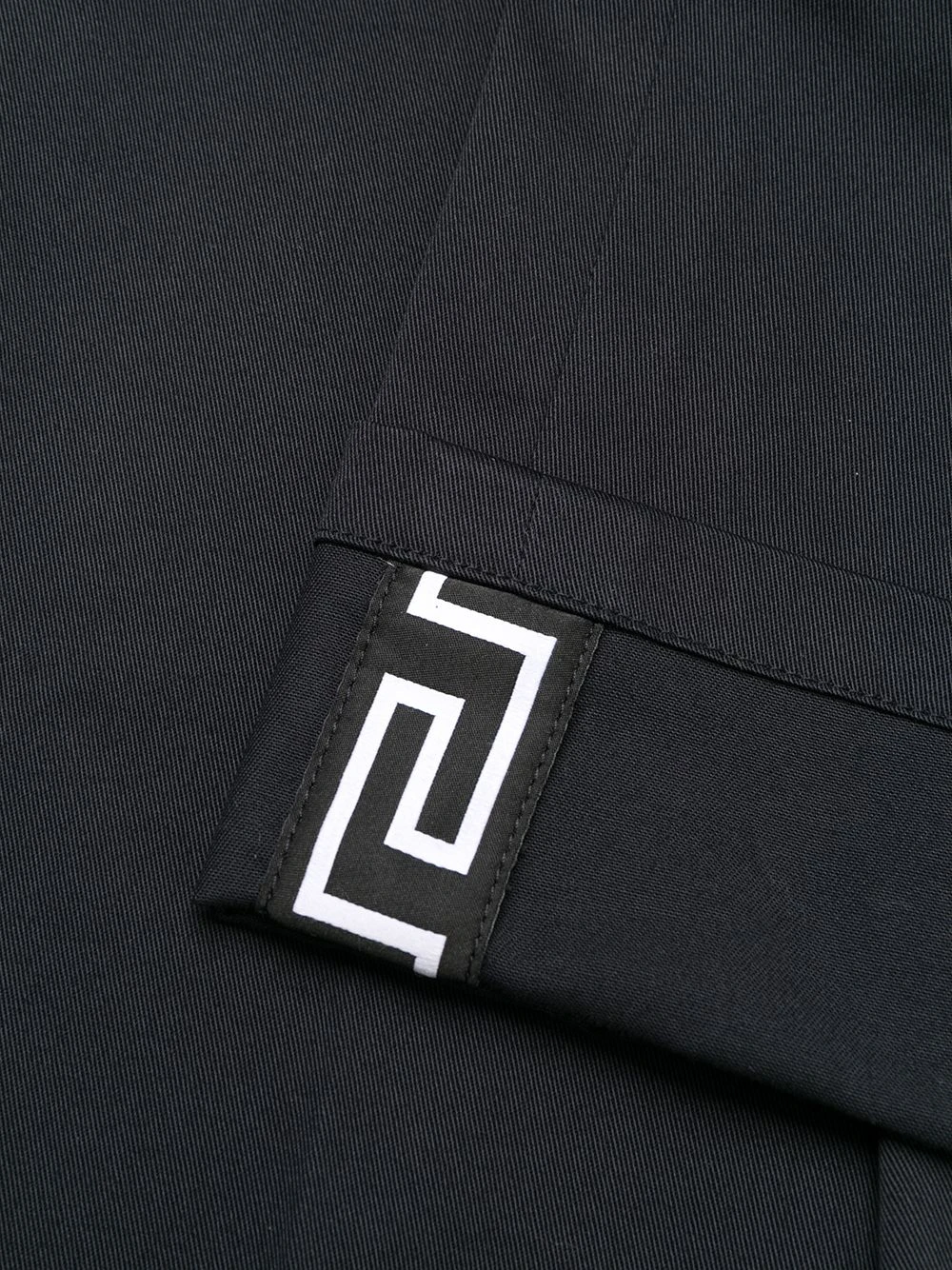Passants de ceinture, coutures ton sur ton, fermeture à zip et boutons sur le devant, poches plaquées latérales, poches arrière passepoilées, coupe ajustée, poignets retroussés. Couleur : noir. Matière : coton.