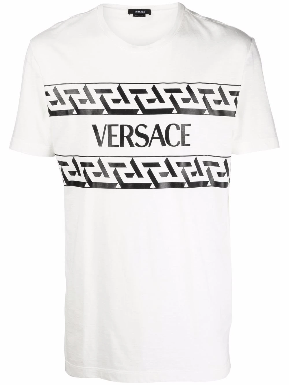 Motif Greca signature imprimé, logo imprimé à la poitrine, encolure ronde, manches courtes. Couleur : blanc. Matière : coton.