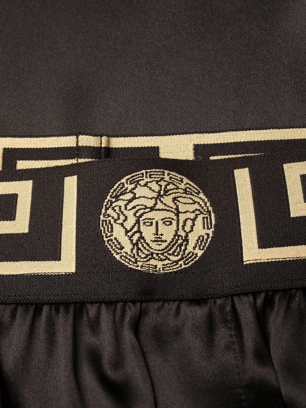 Ceinture élastique, détail Greca signature, fermeture boutonnée, coupe droite. Couleur : noir.