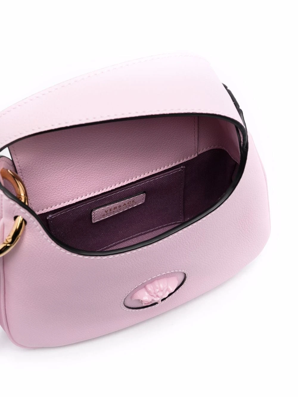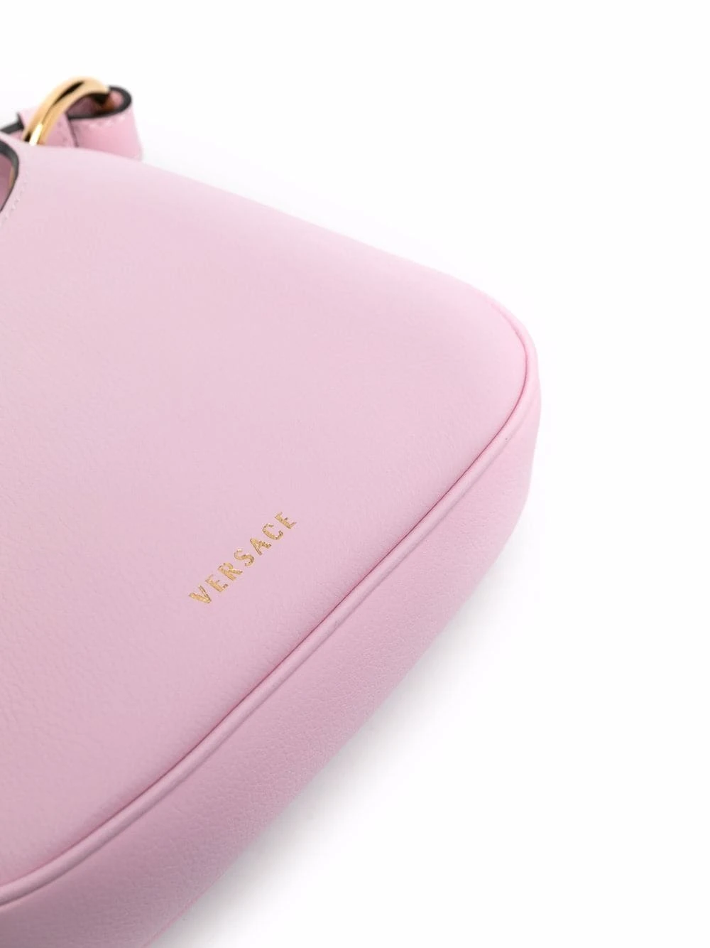 Motif Medusa, bride porté épaule ajustable, logo imprimé à l’arrière. Couleur : rose. Matière : cuir de veau.