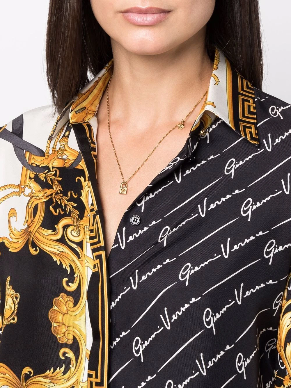 Détail de cadenas, finitions en métal doré, motif Medusa, chaîne fine.