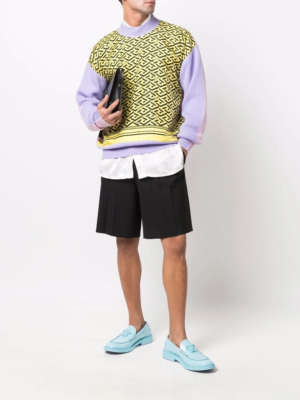 Design à empiècements colour block, motif Greca signature imprimé, design en maille, encolure ras du cou, manches longues, poignets élastiqués, ourlet élastiqué.