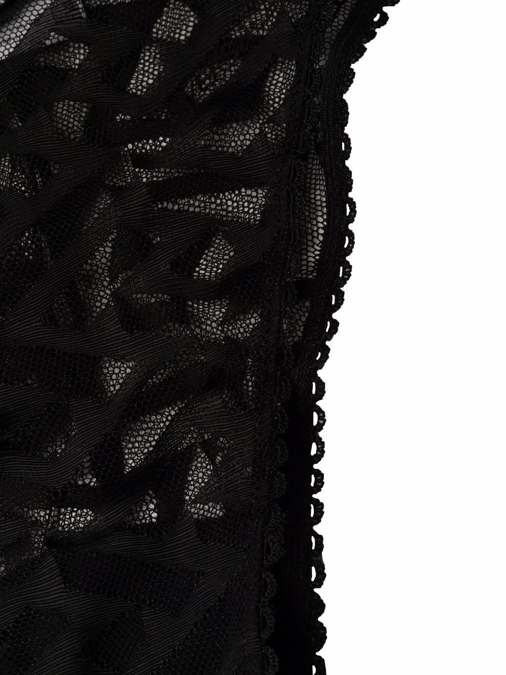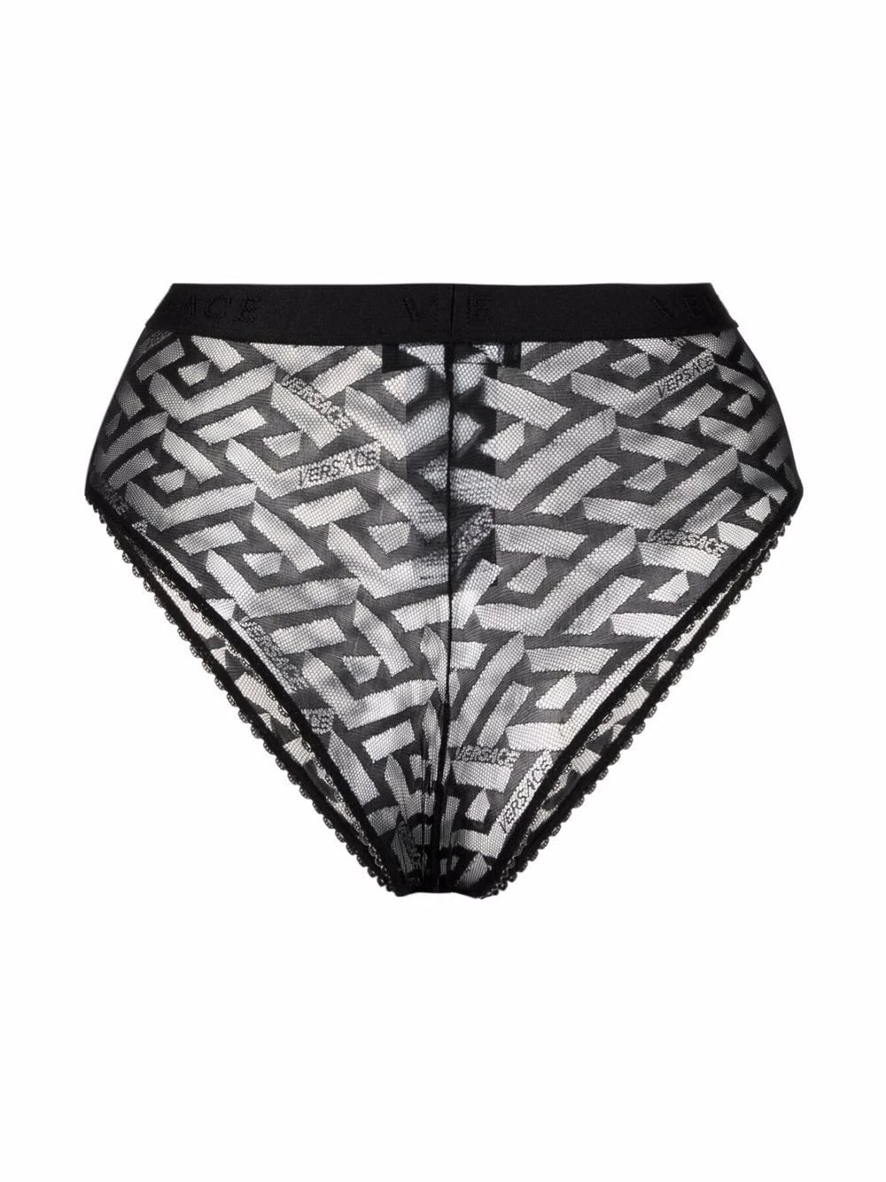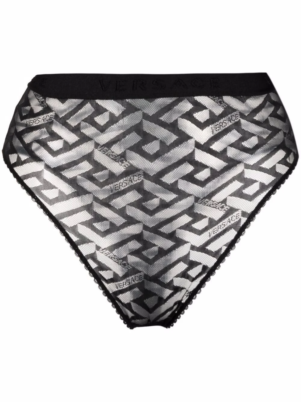 Motif Greca signature imprimé, taille haute, détails en dentelle, ceinture élastique. Couleur : noir.