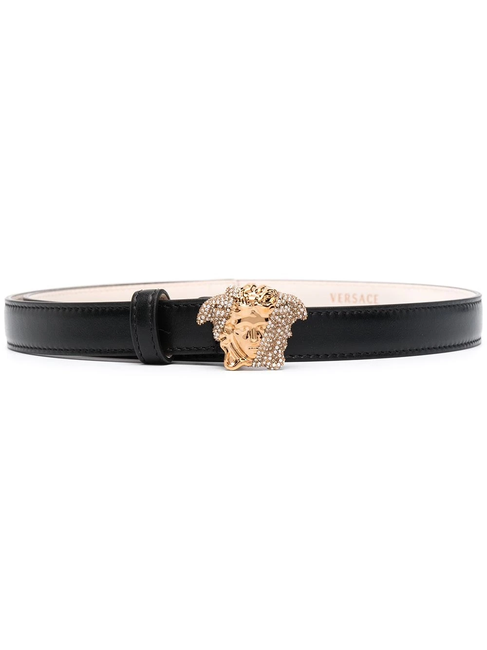 Finitions en métal doré, ornement en cristal, motif Medusa, taille ajustable. Couleur : noir. Matière : cuir.