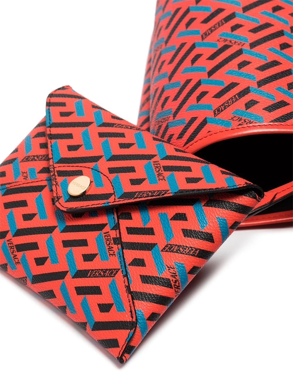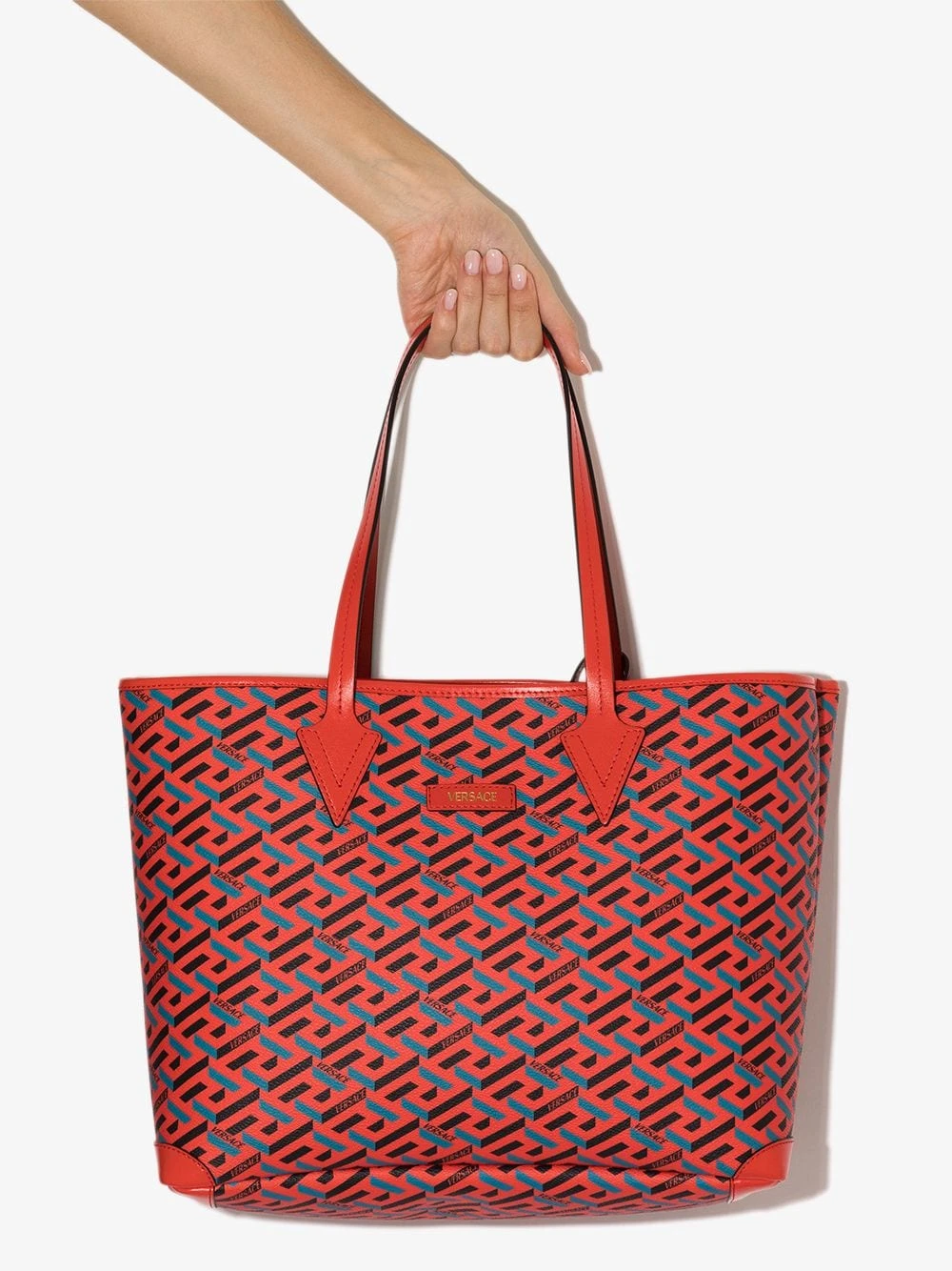 Imprimé La Greca signature, anses sur le dessus, logo doré, pochette détachable, ouverture sur le dessus. Matière : cuir.