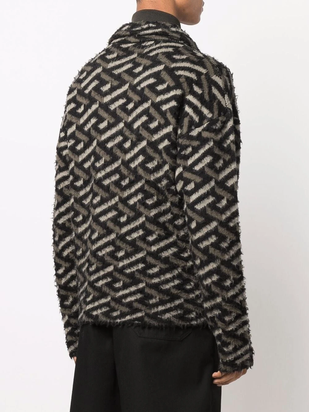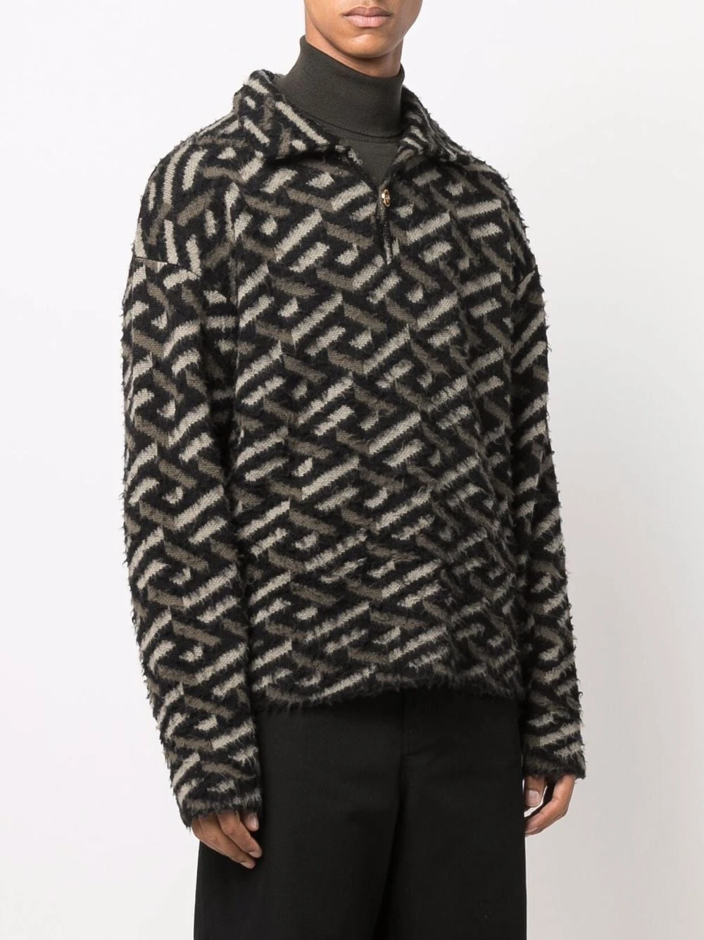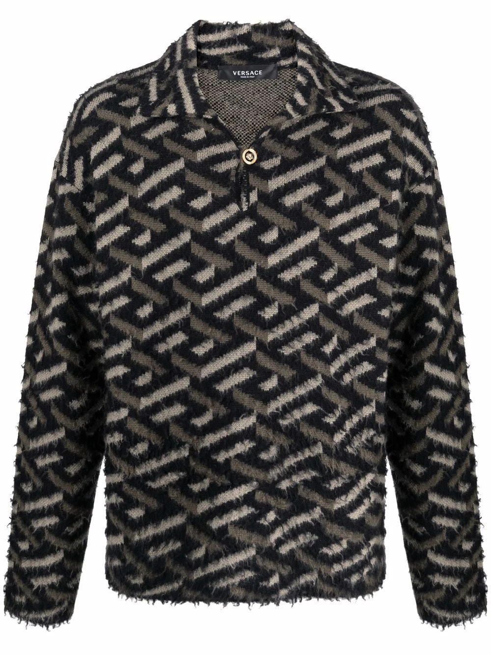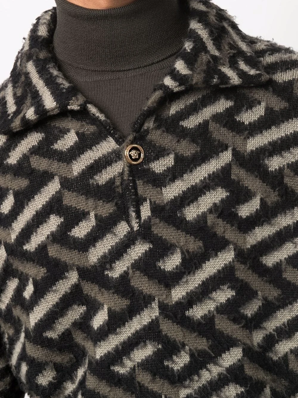 Design en maille, col classique, patte de boutonnage sur le devant, manches longues, imprimé La Greca signature.