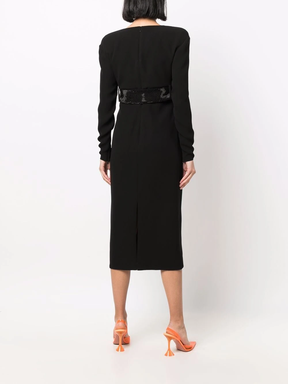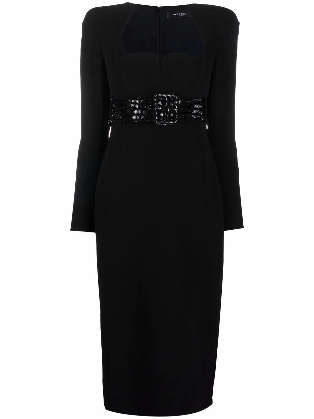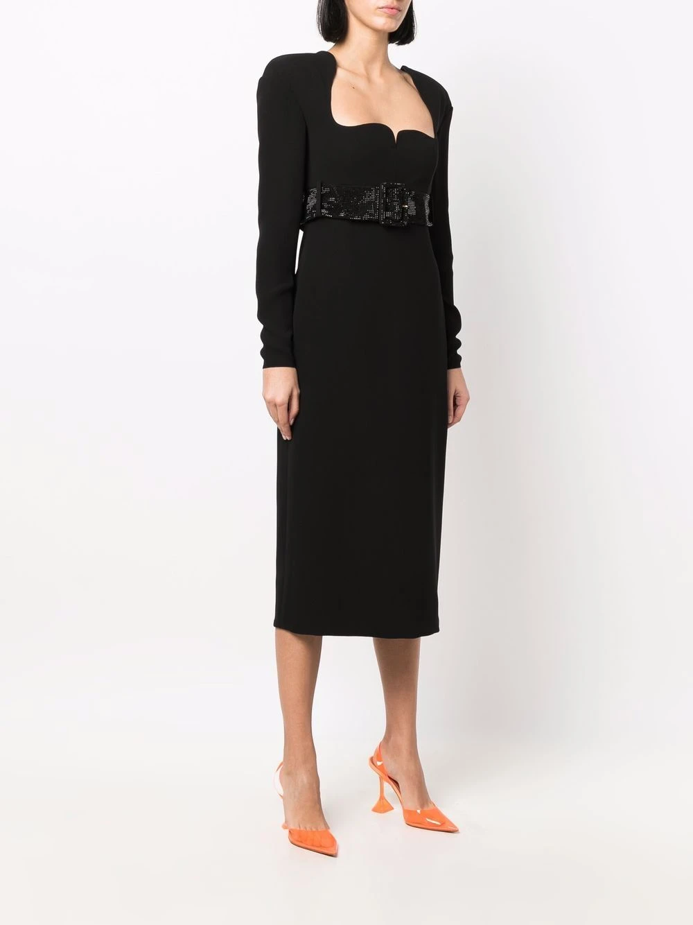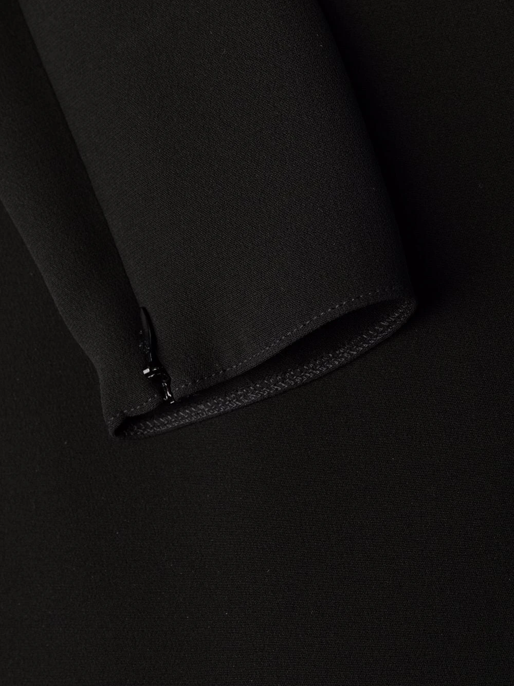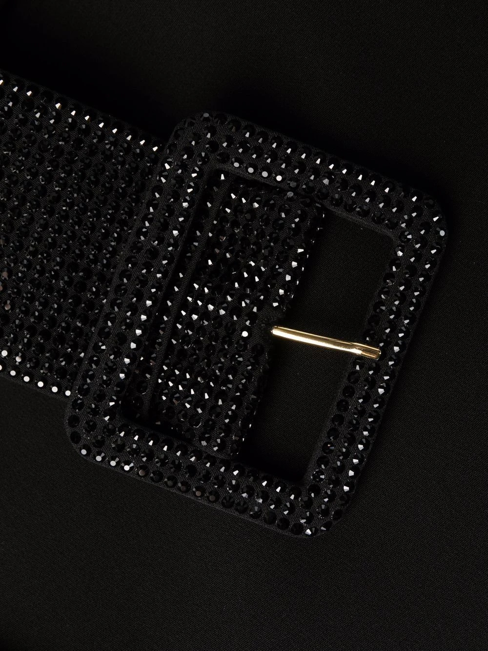 Taille empire, fermeture zippée dissimulée à l’arrière, manches longues, ornement en strass, ceinture détachable, fente arrière centrale, coupe mi-longue. Couleur : noir. Matière : soie.