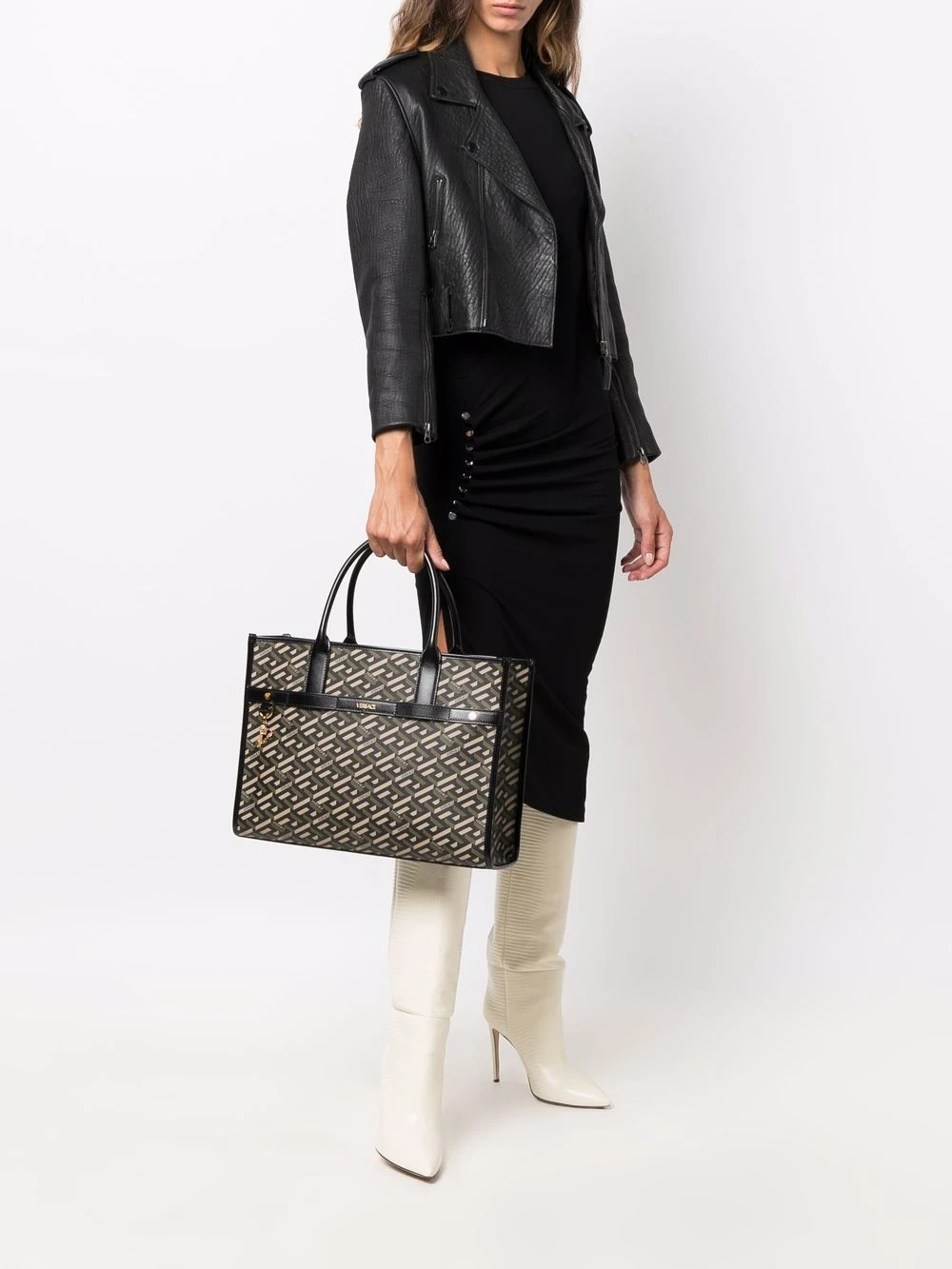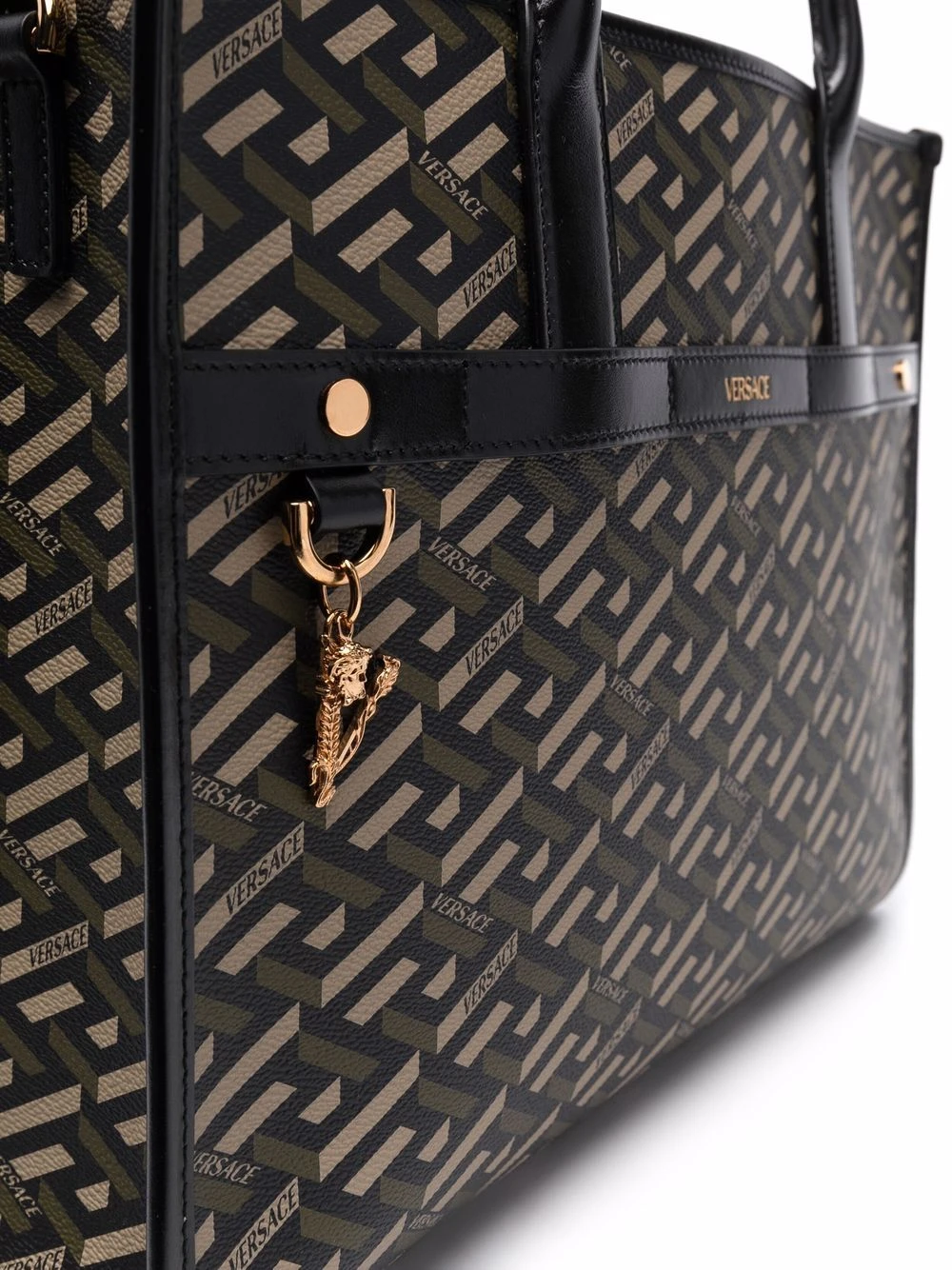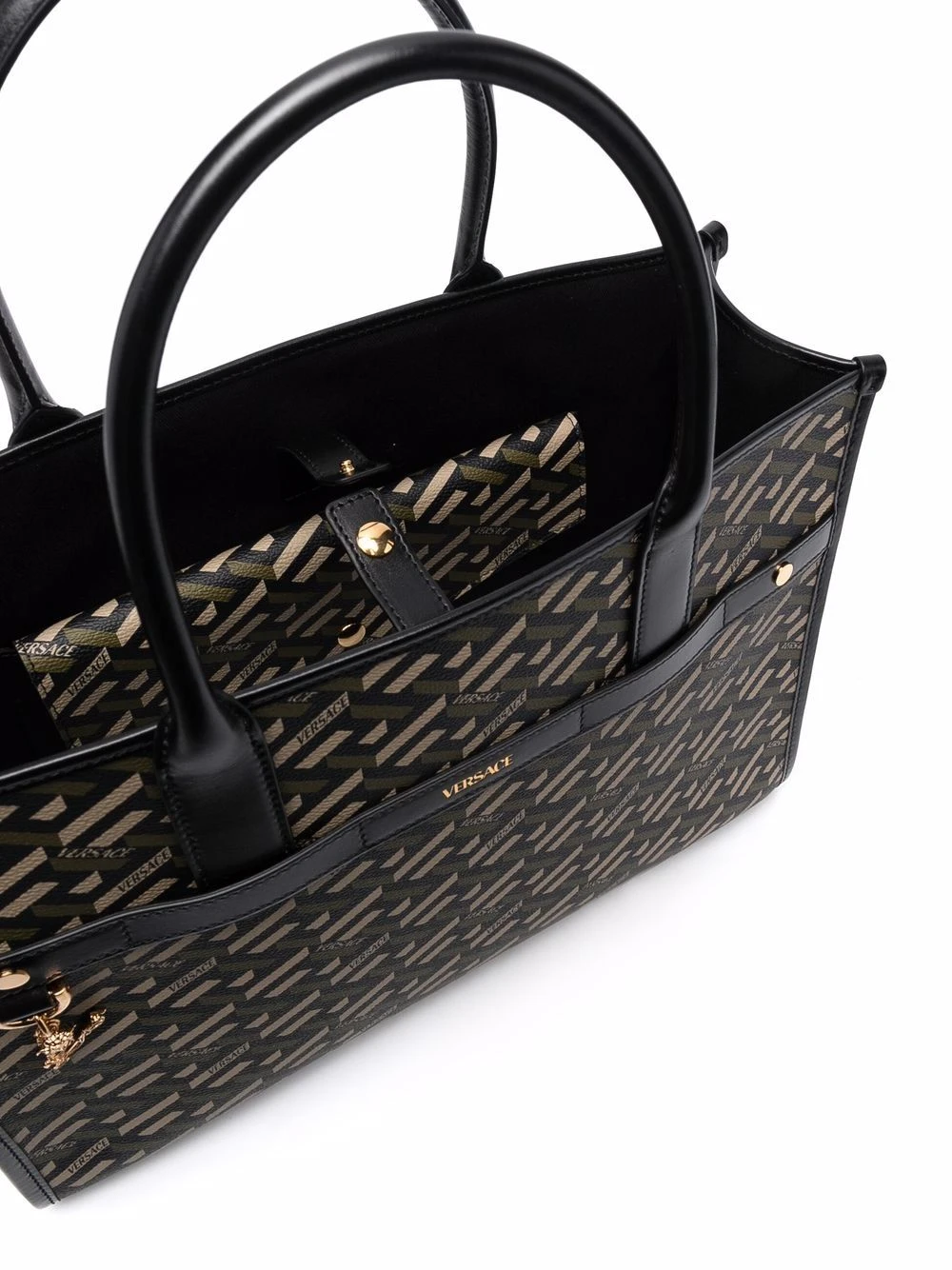 Imprimé La Greca signature, détail de logo Virtus signature, finitions en métal doré, fermeture à boutons pression, pochette détachable, anses arrondies, bride porté épaule détachable.