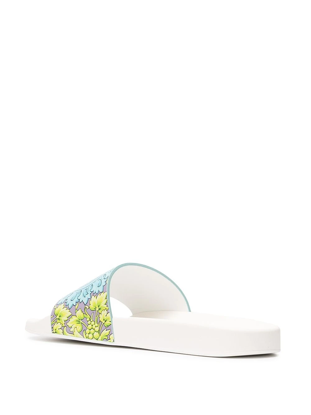 Motif Medusa, imprimé Barocco signature, bout ouvert, semelle plate. Matière : cuir.