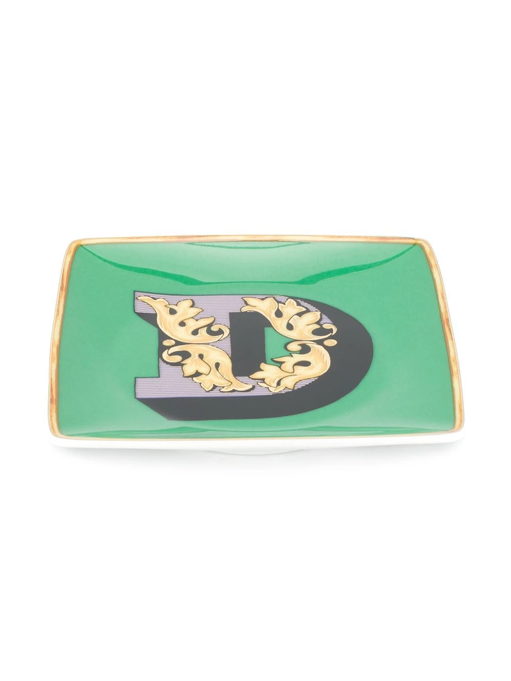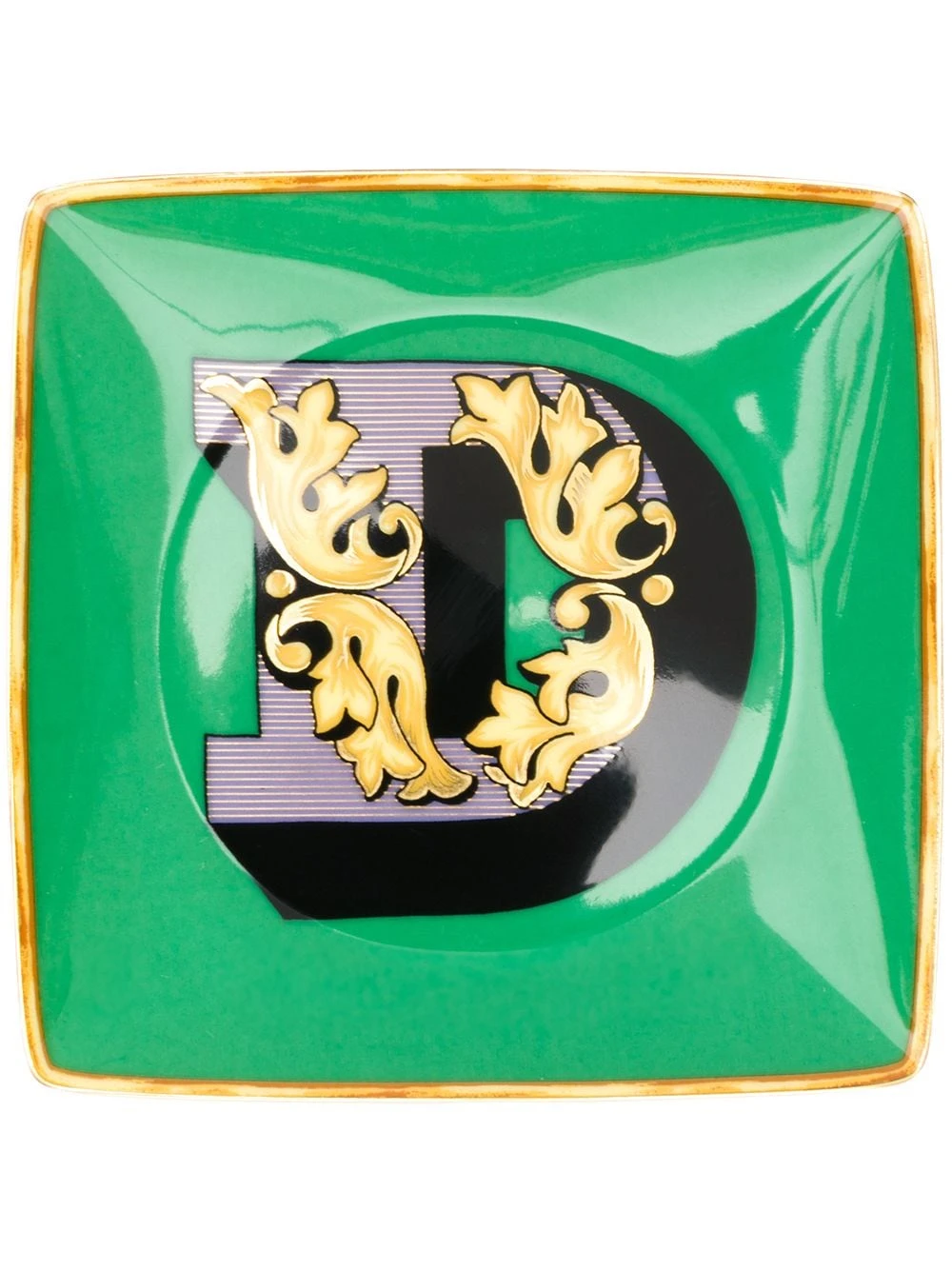 Assiestte Holiday Alphabet ‘D’ Versace Home avec forme carrée, imprimé baroque et dessus concave. Couleur : vert.