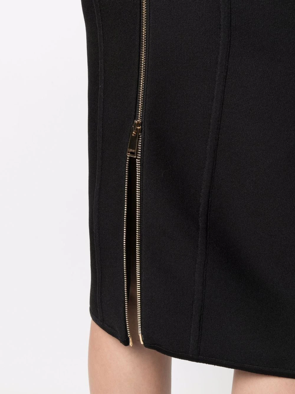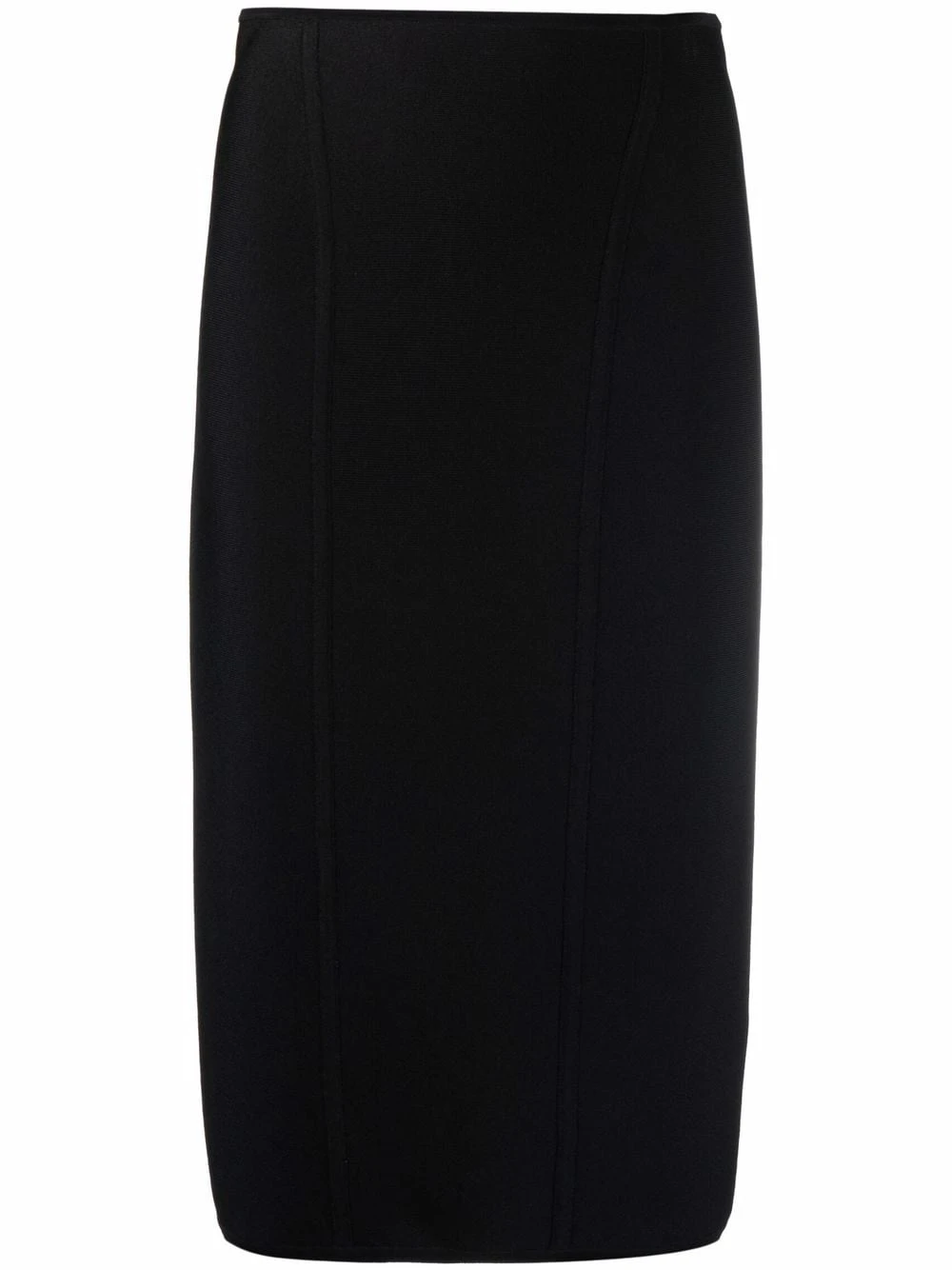 Taille haute, fermeture zippée à l’arrière, coupe mi-longue, construction stretch. Couleur : noir.