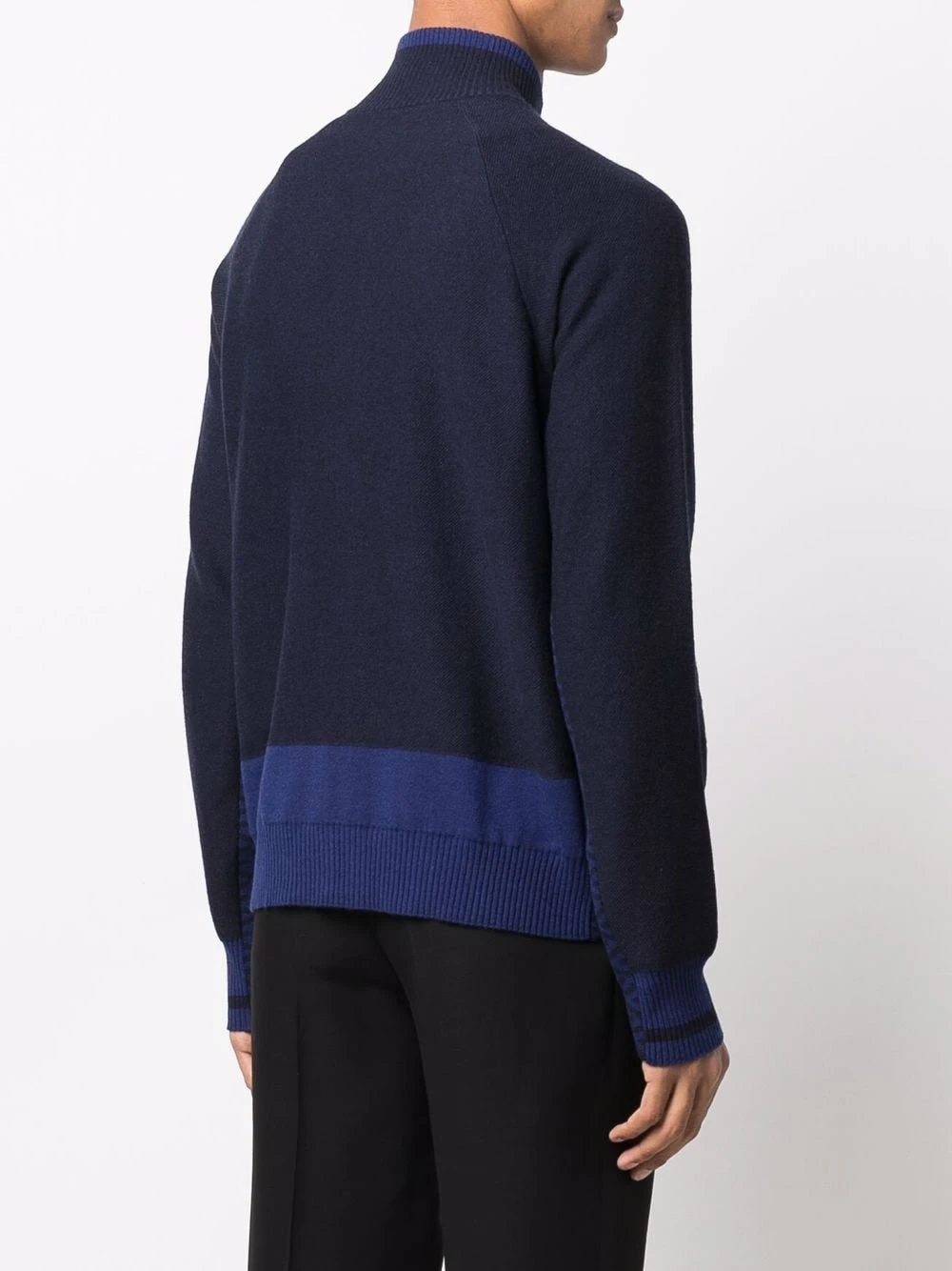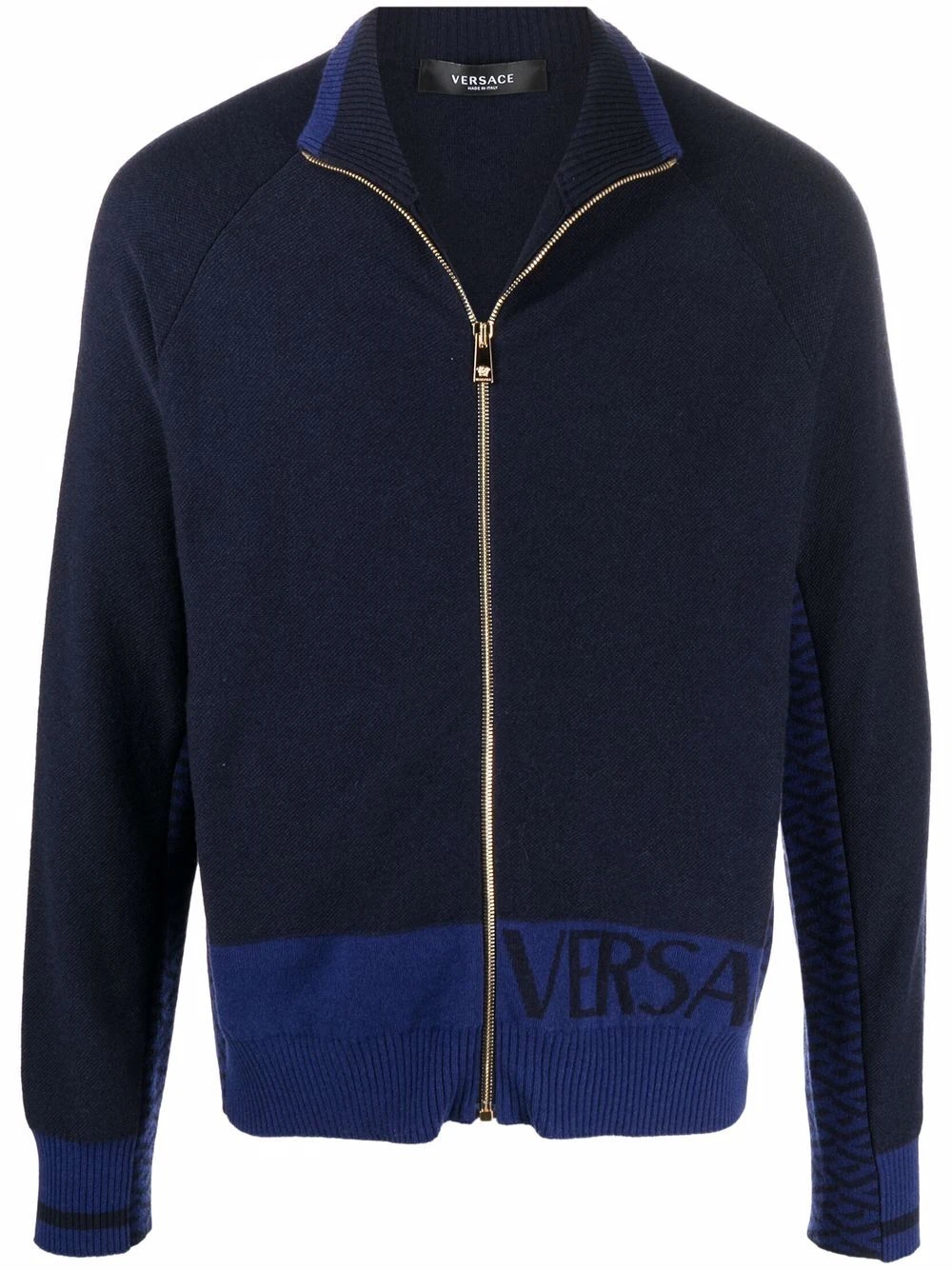 Jacquard à motif logo, imprimé La Greca signature, col montant, manches longues, fermeture zippée devant, bordures nervurées.