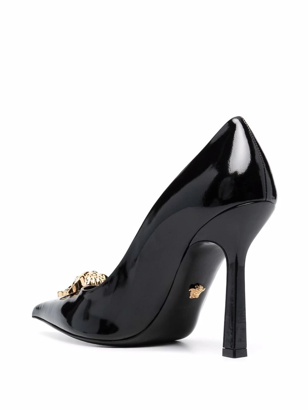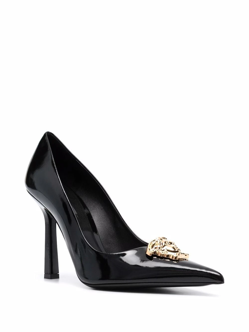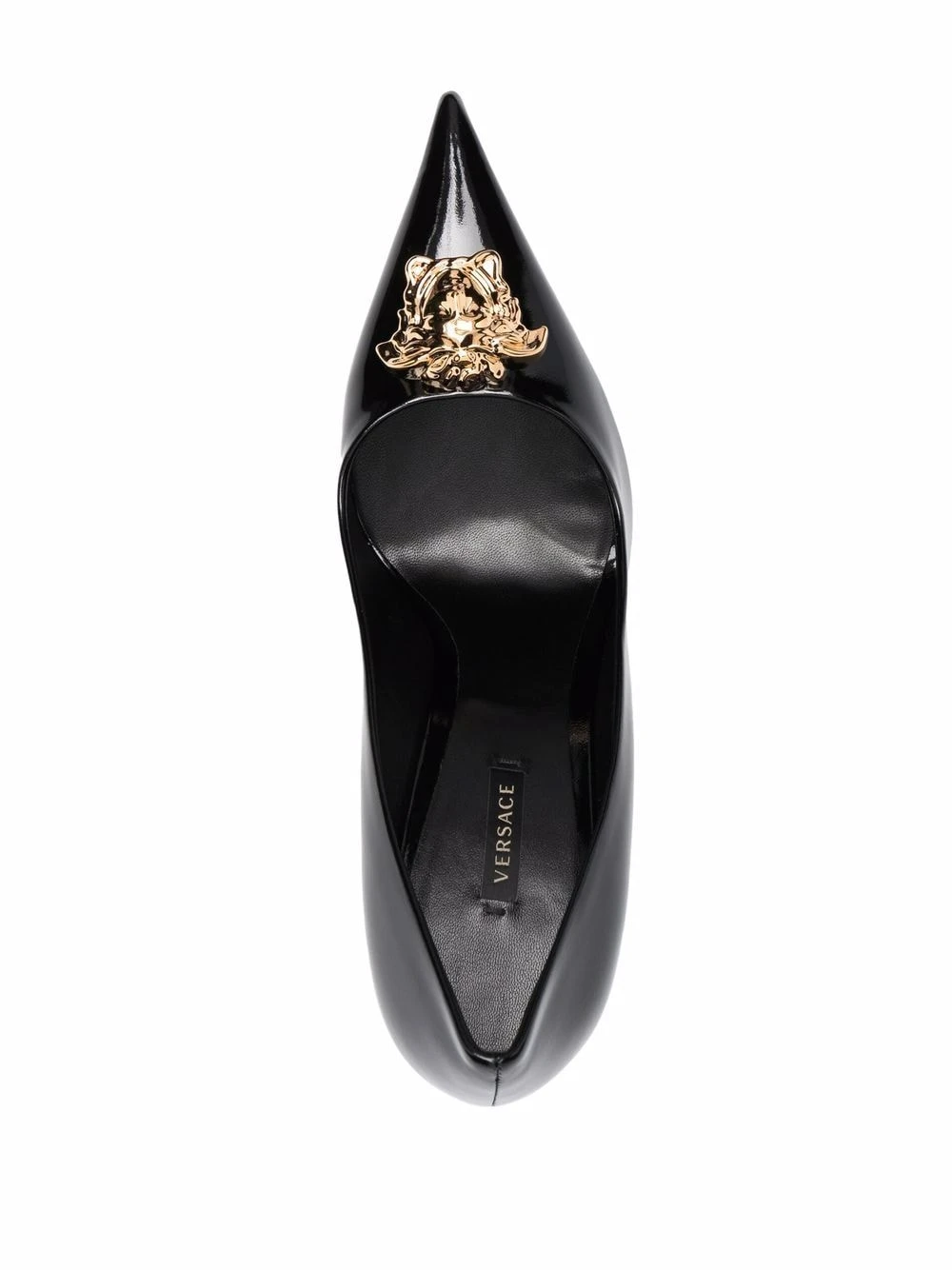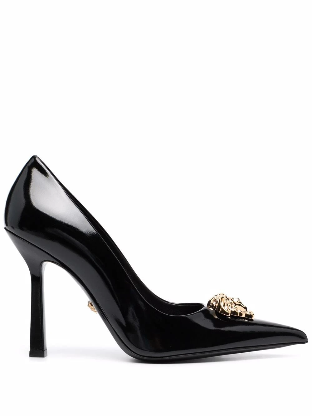 Bout pointu, détail Medusa, semelle intérieure à logo, coutures ton sur ton, design à enfiler, talon aiguille haut. Couleur : noir.