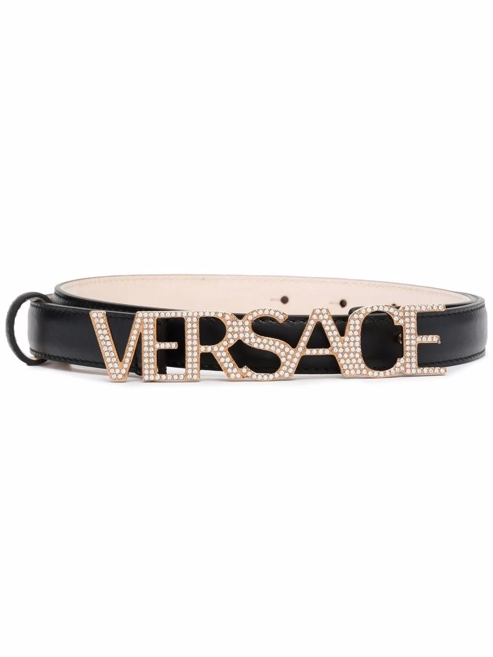 Ornement en cristal, plaque logo dorée, passants de ceinture, fermeture à boutons pression. Couleur : noir. Matière : cuir.