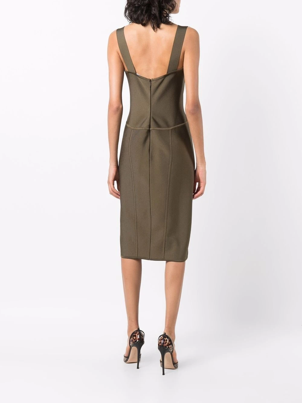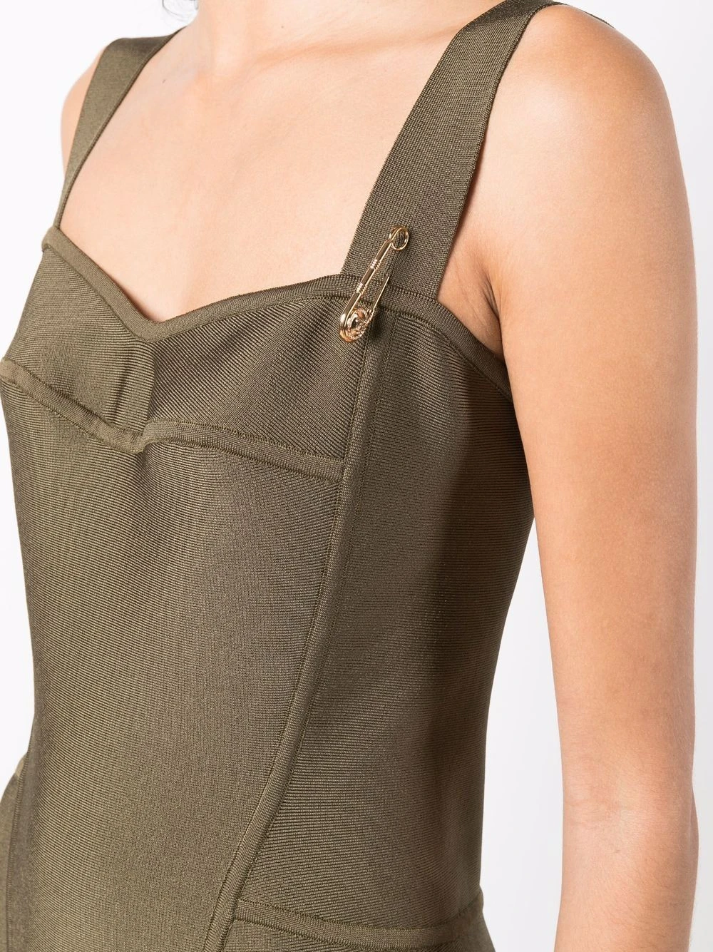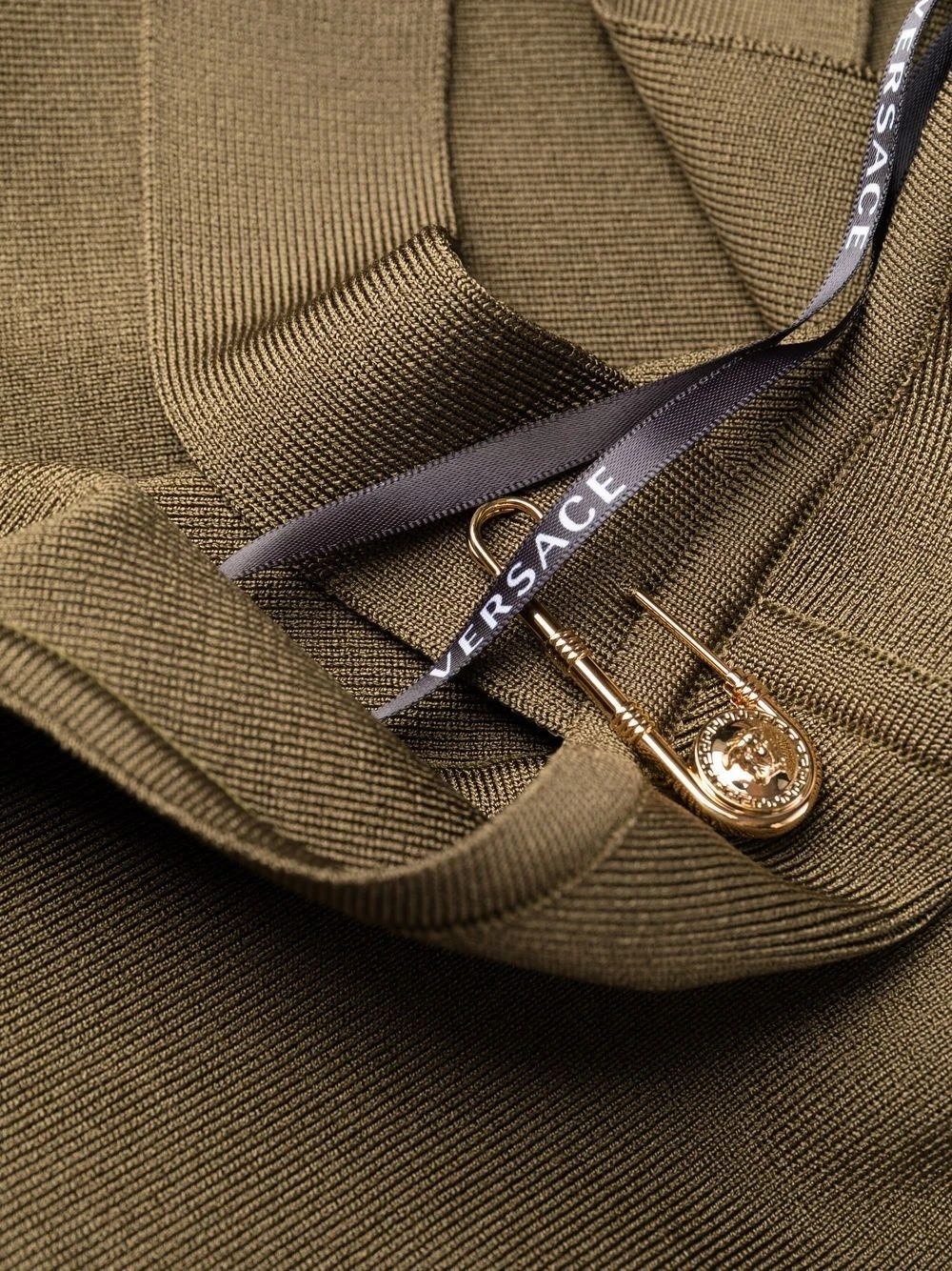 Détail d’épingle Medusa signature, détail nervuré, encolure cœur, fermeture zippée à l’arrière.
