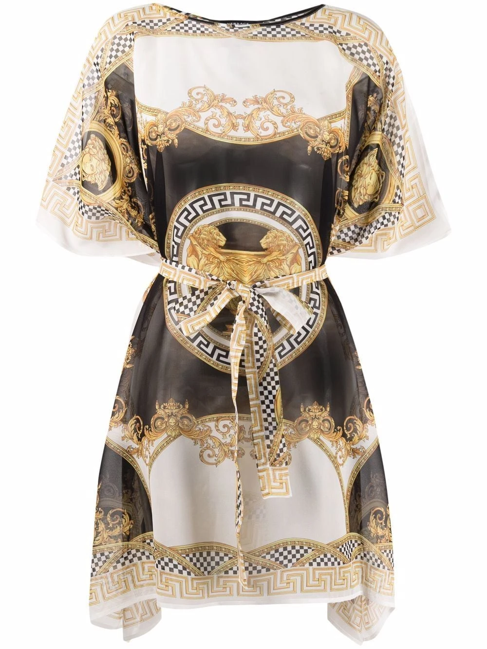 Imprimé Barocco signature, encolure ronde, manches courtes, taille ceinturée. Couleur : blanc.