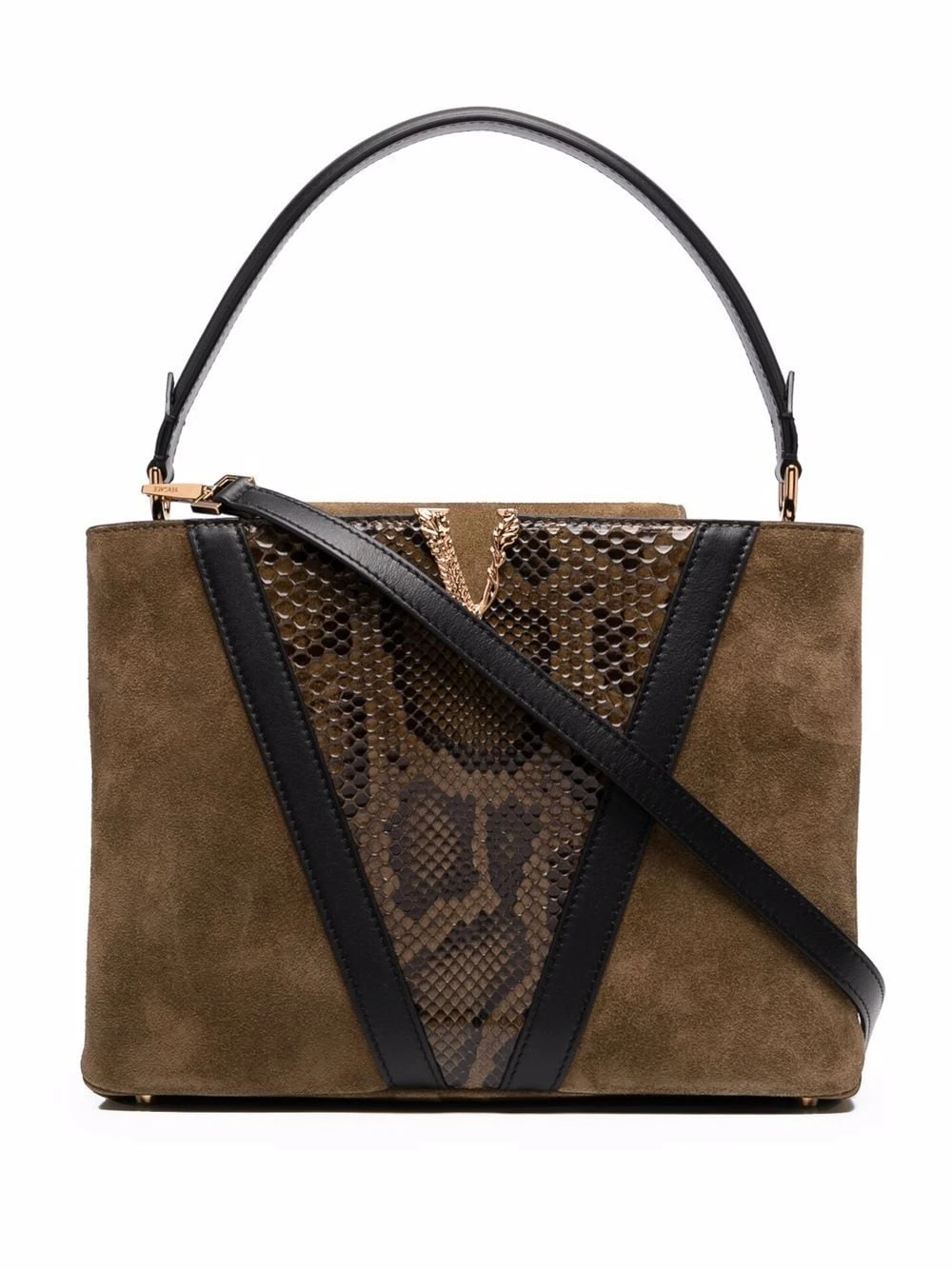 Design à empiècements, plaque logo dorée, imprimé python, anse arrondie, bride porté épaule détachable et ajustable, compartiment intérieur, logo imprimé à l’intérieur, poche intérieure plaquée. Couleur : marron. Matière : cuir.