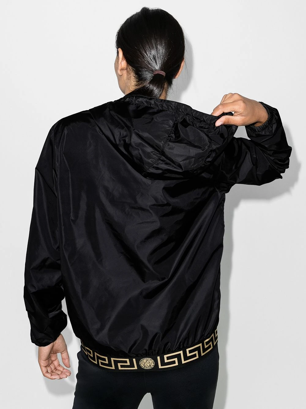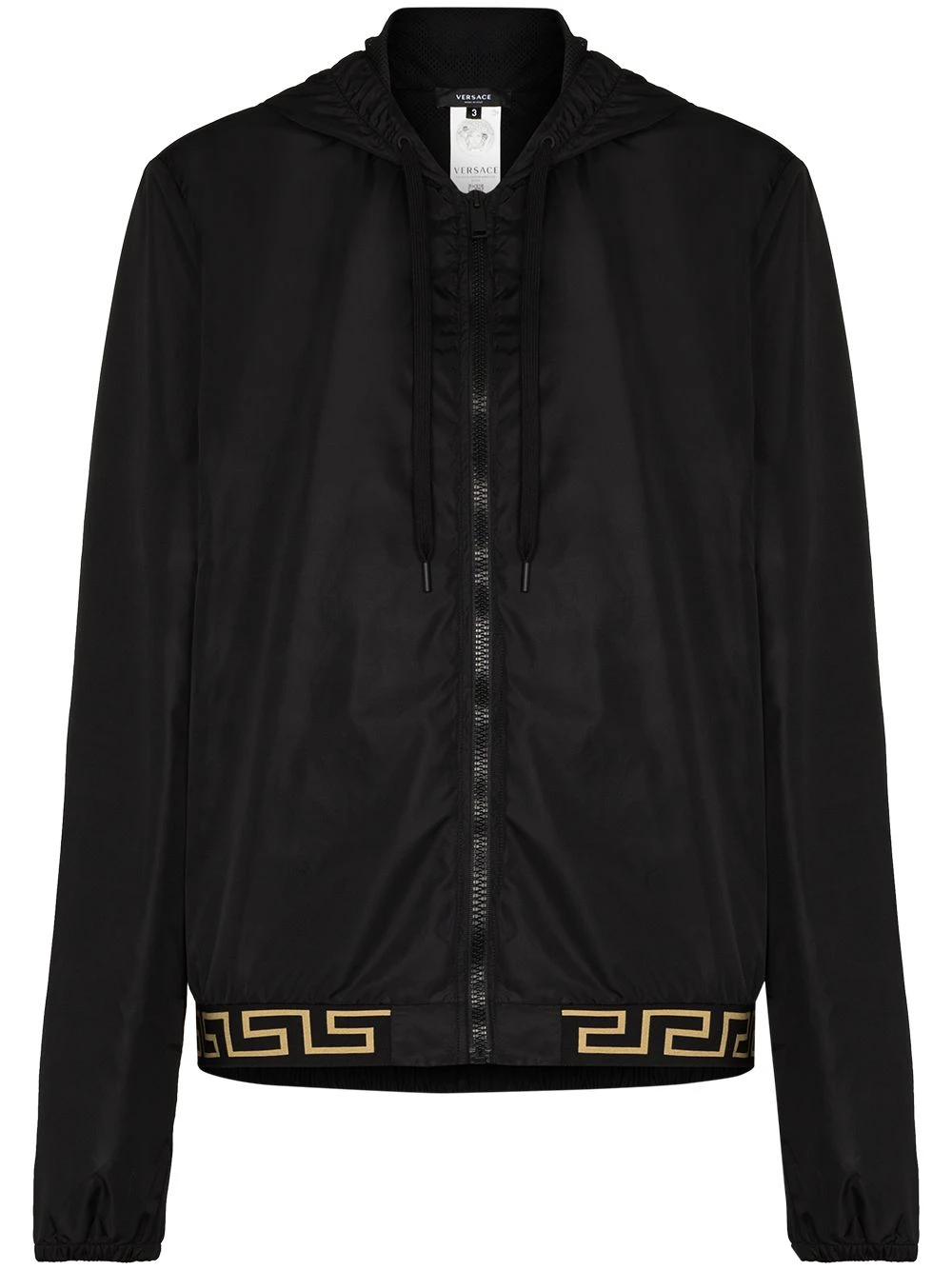 Détail Greca signature, capuche à lien de resserrage, fermeture zippée devant, manches longues, poignets élastiqués, ourlet droit.