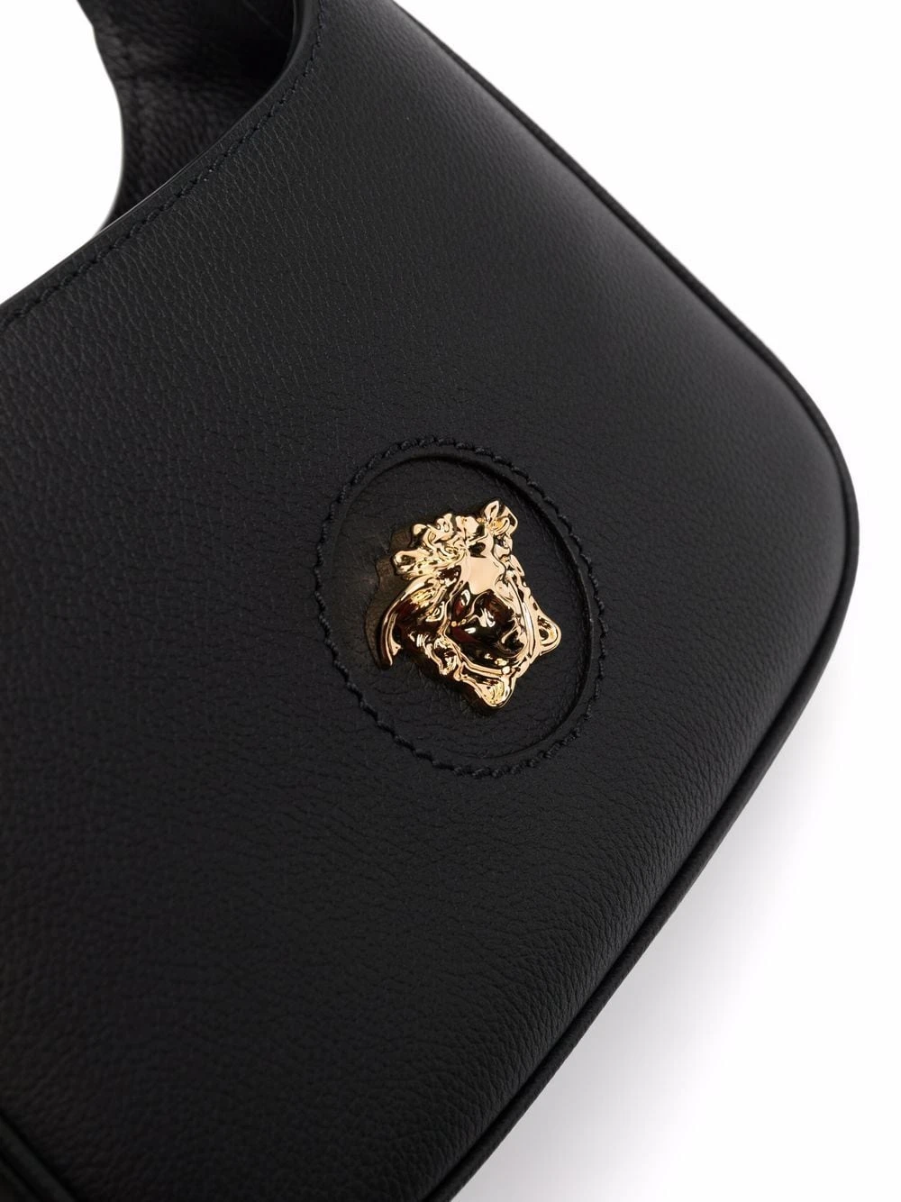 Texture grainée, logo imprimé à l’arrière, motif Medusa, bride porté épaule ajustable. Couleur : noir. Matière : cuir.