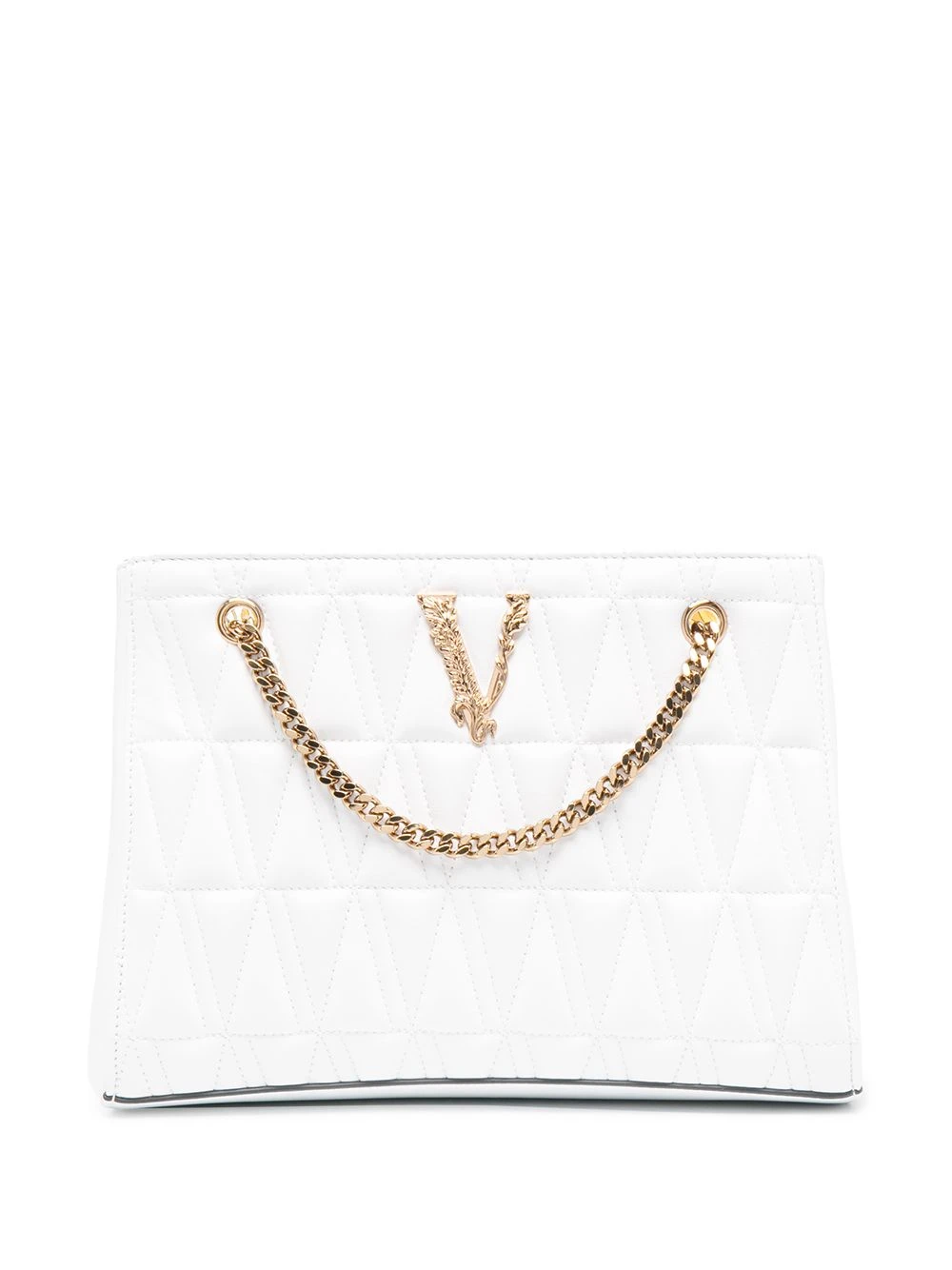 Design matelassé, plaque logo dorée, deux anses à maillons de chaîne sur le dessus, compartiment intérieur, poche intérieure zippée, poche intérieure plaquée. Couleur : blanc. Matière : cuir.