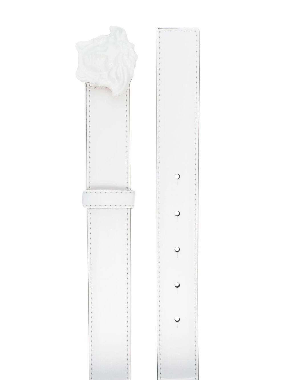 Détail Medusa, trous percés, passants de ceinture, taille ajustable. Couleur : blanc. Matière : cuir.