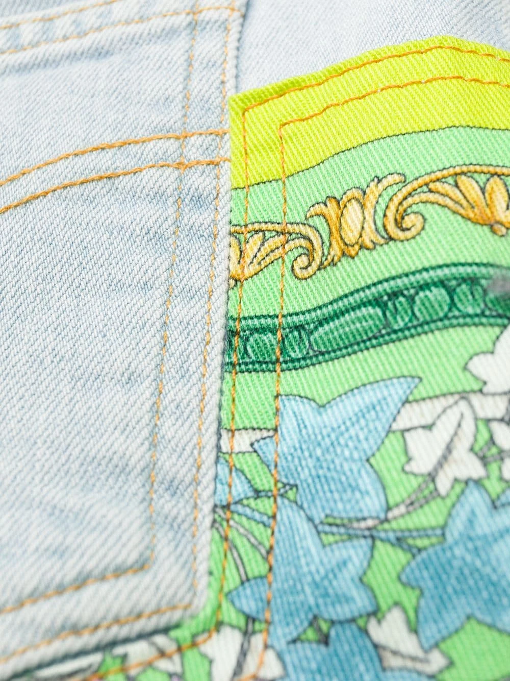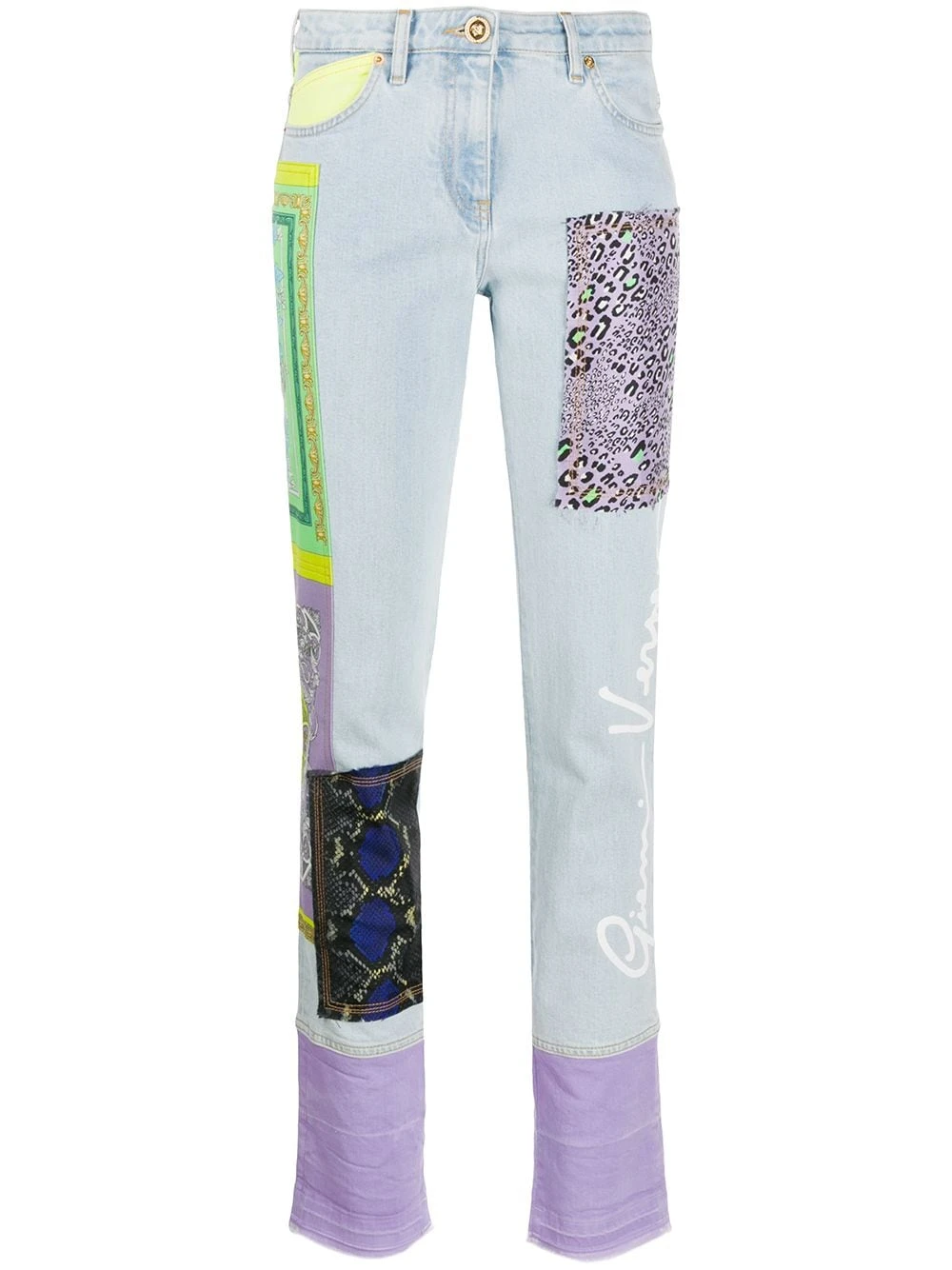 Design patchwork, imprimé Barocco signature, coupe droite, fermeture à zip et boutons sur le devant, taille mi-haute, 5 poches classiques, passants de ceinture.