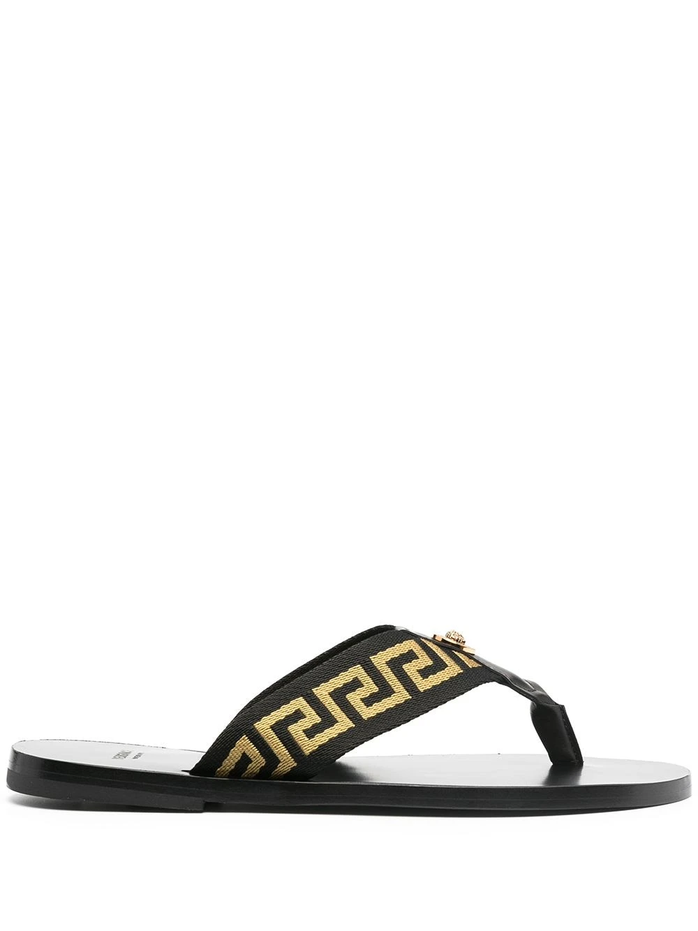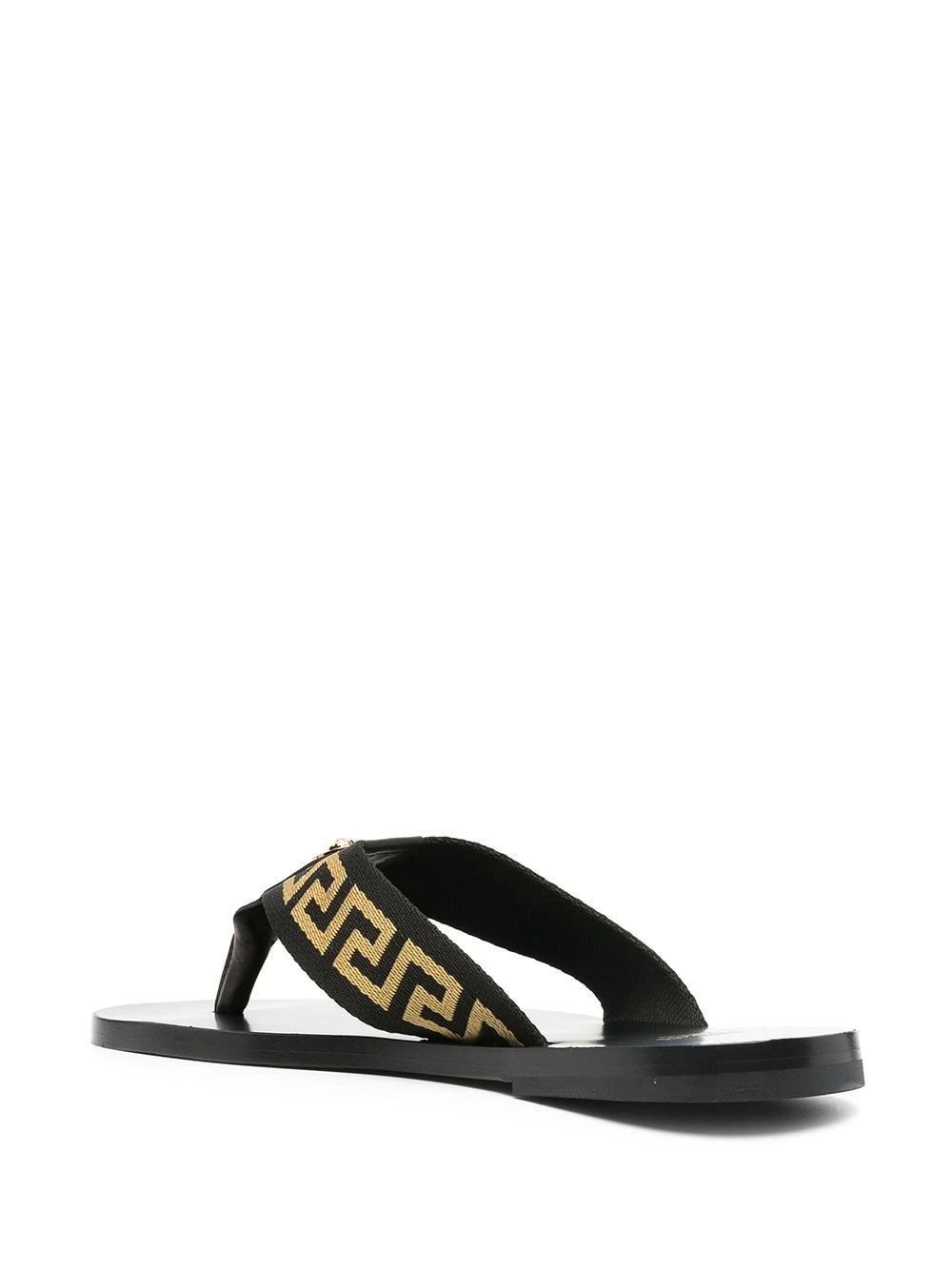 Motif Greca signature imprimé, détail Medusa, entre-doigts, semelle en cuir. Couleur : noir. Matière : cuir.