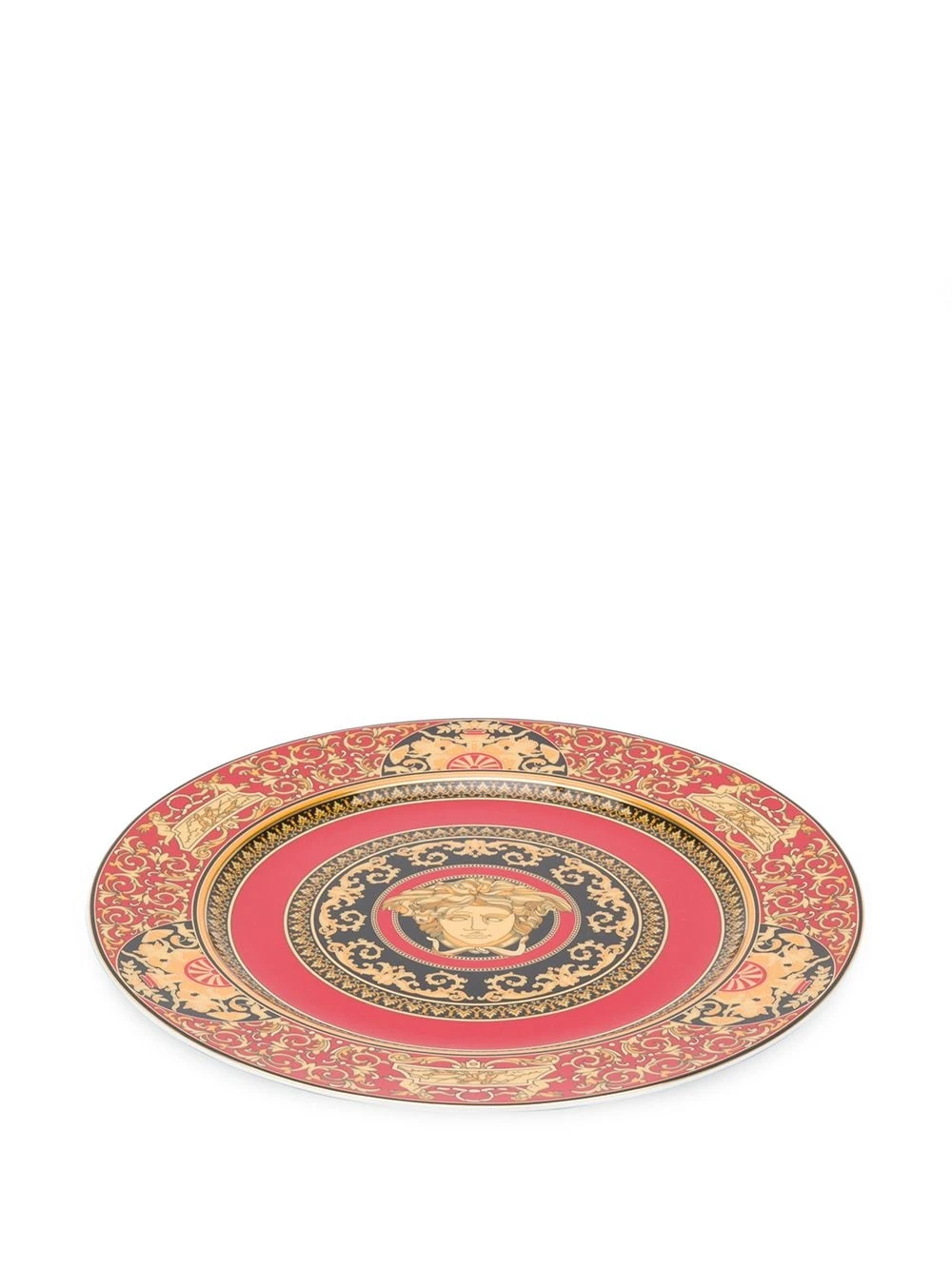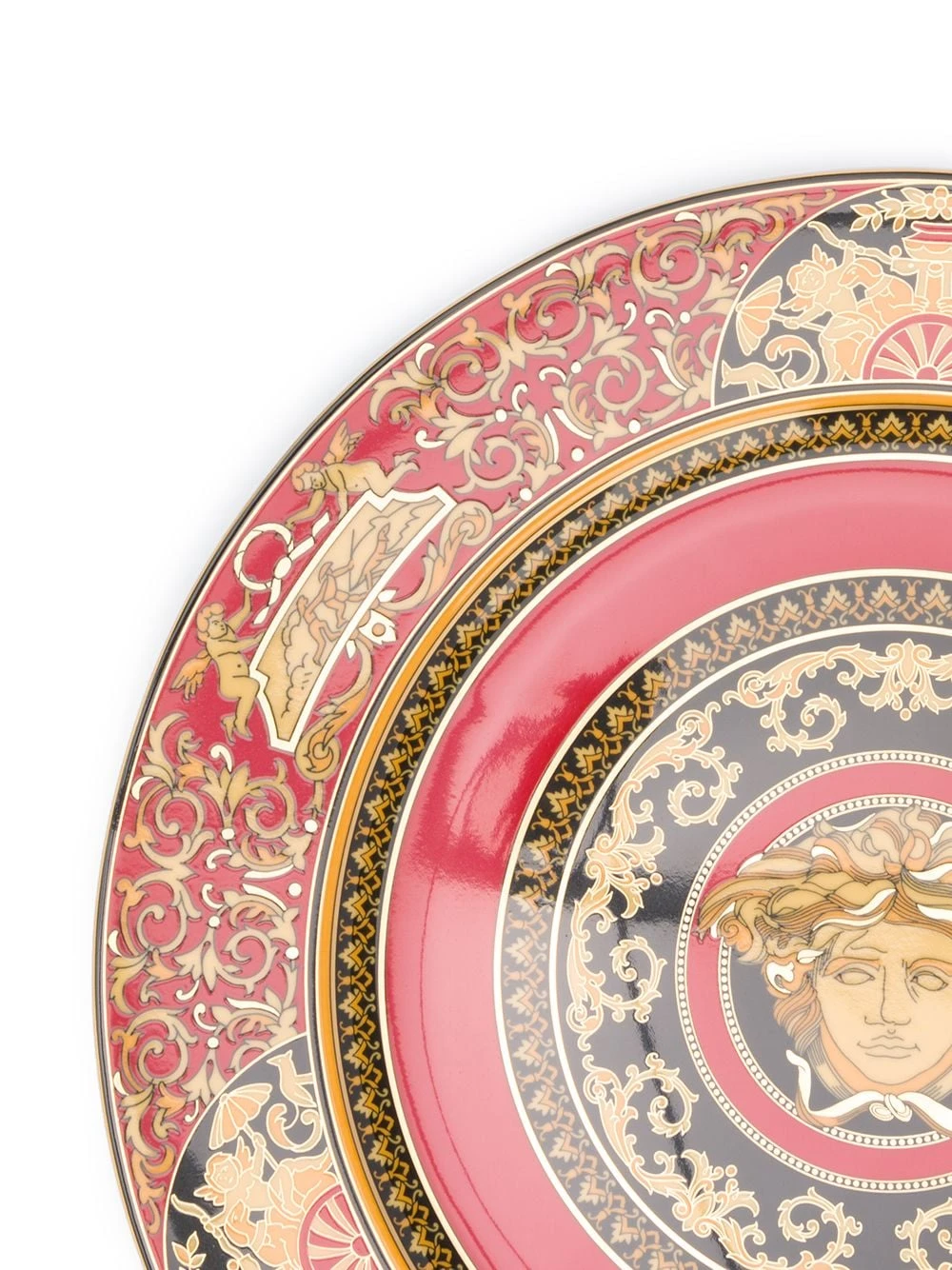 Assiette Ikarus Medusa à imprimé baroque Versace Home avec imprimé baroque, détail Medusa et structure incurvée.