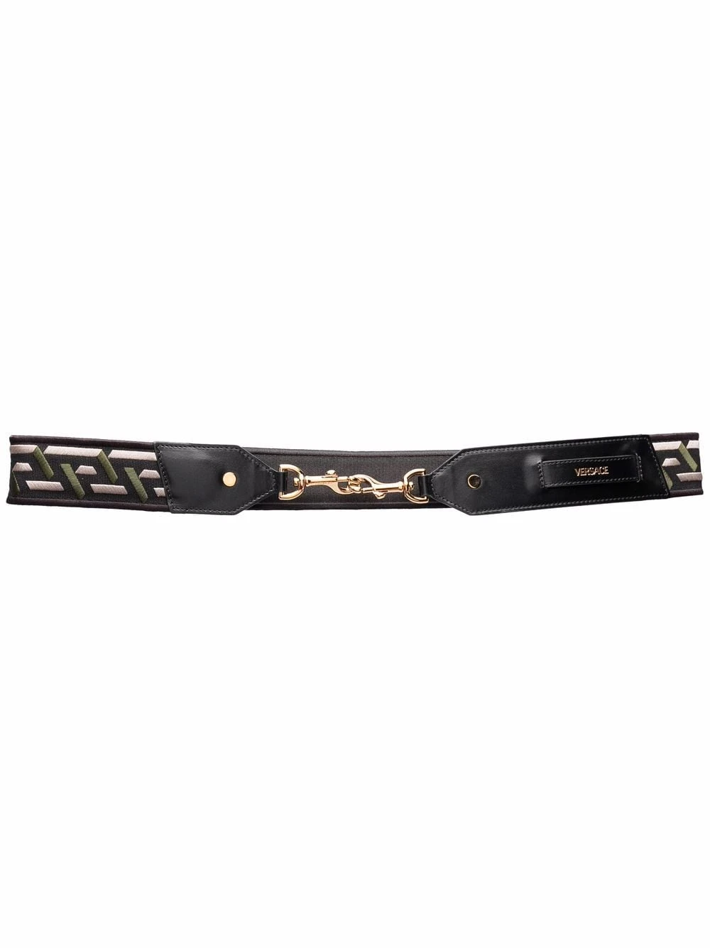 Finitions en métal doré, imprimé La Greca signature, fermoir mousqueton. Matière : cuir.