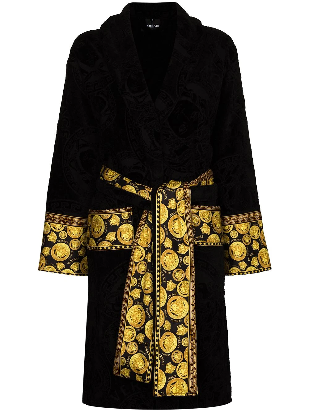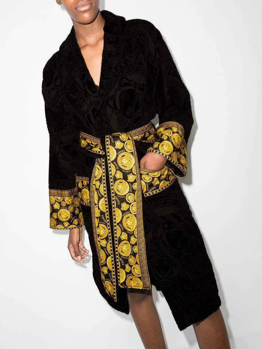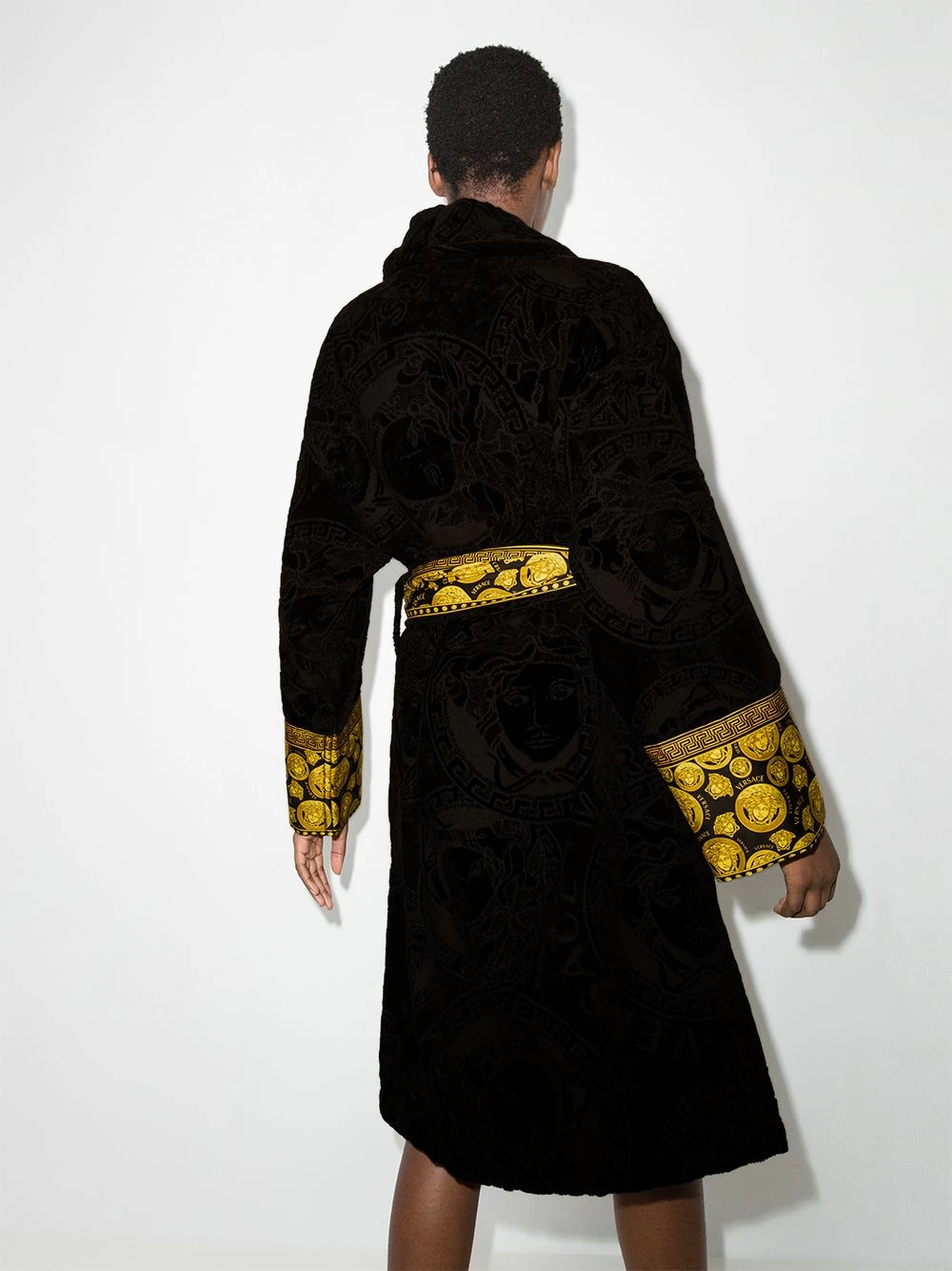 Motif Medusa, taille ceinturée, manches longues, hauteur genou. Couleur : noir. Matière : coton.