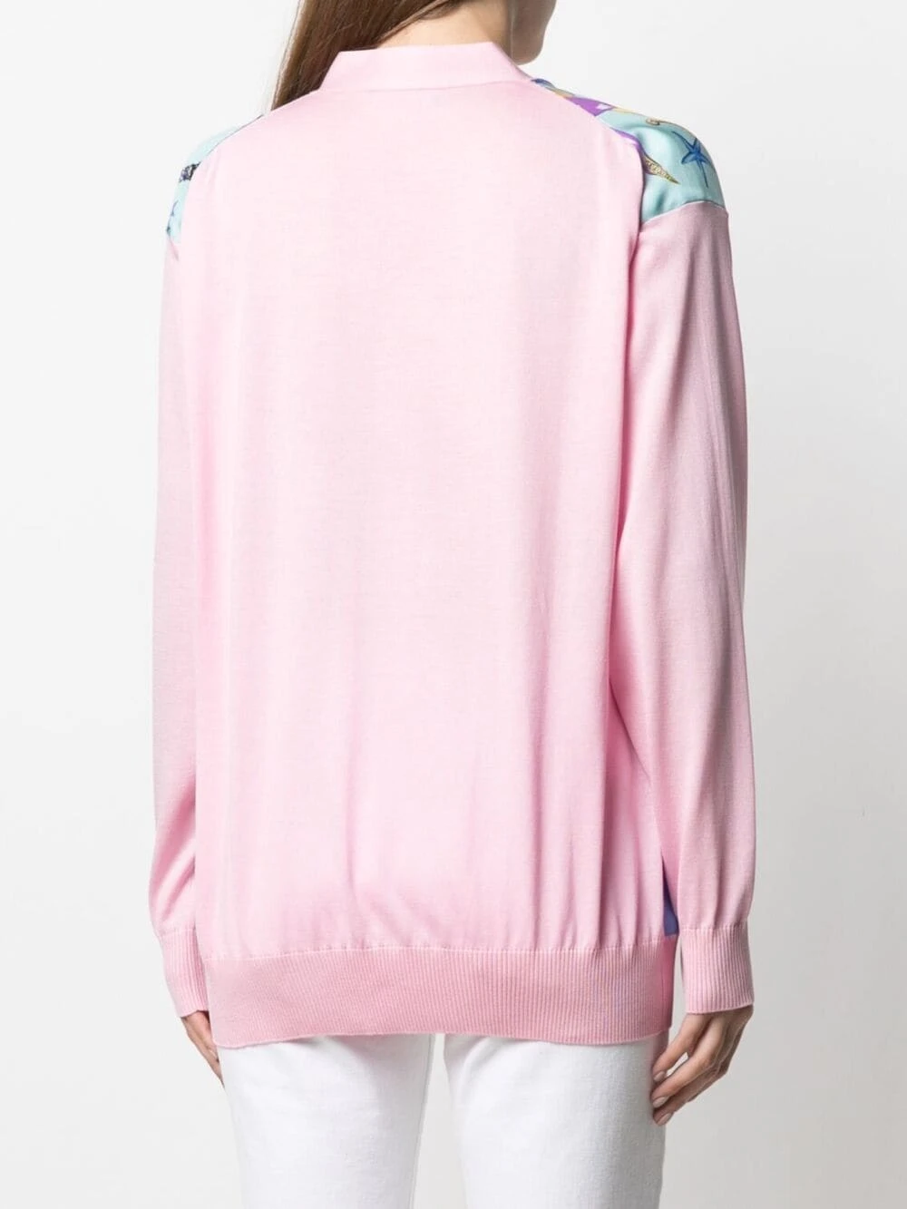 Coquillage imprimé, col v, boutonnière sur le devant, effet d’épaules descendues, manches longues. Couleur : multicolore. Matière : soie.