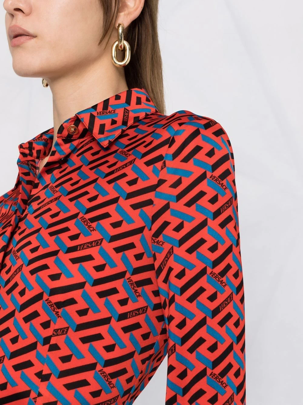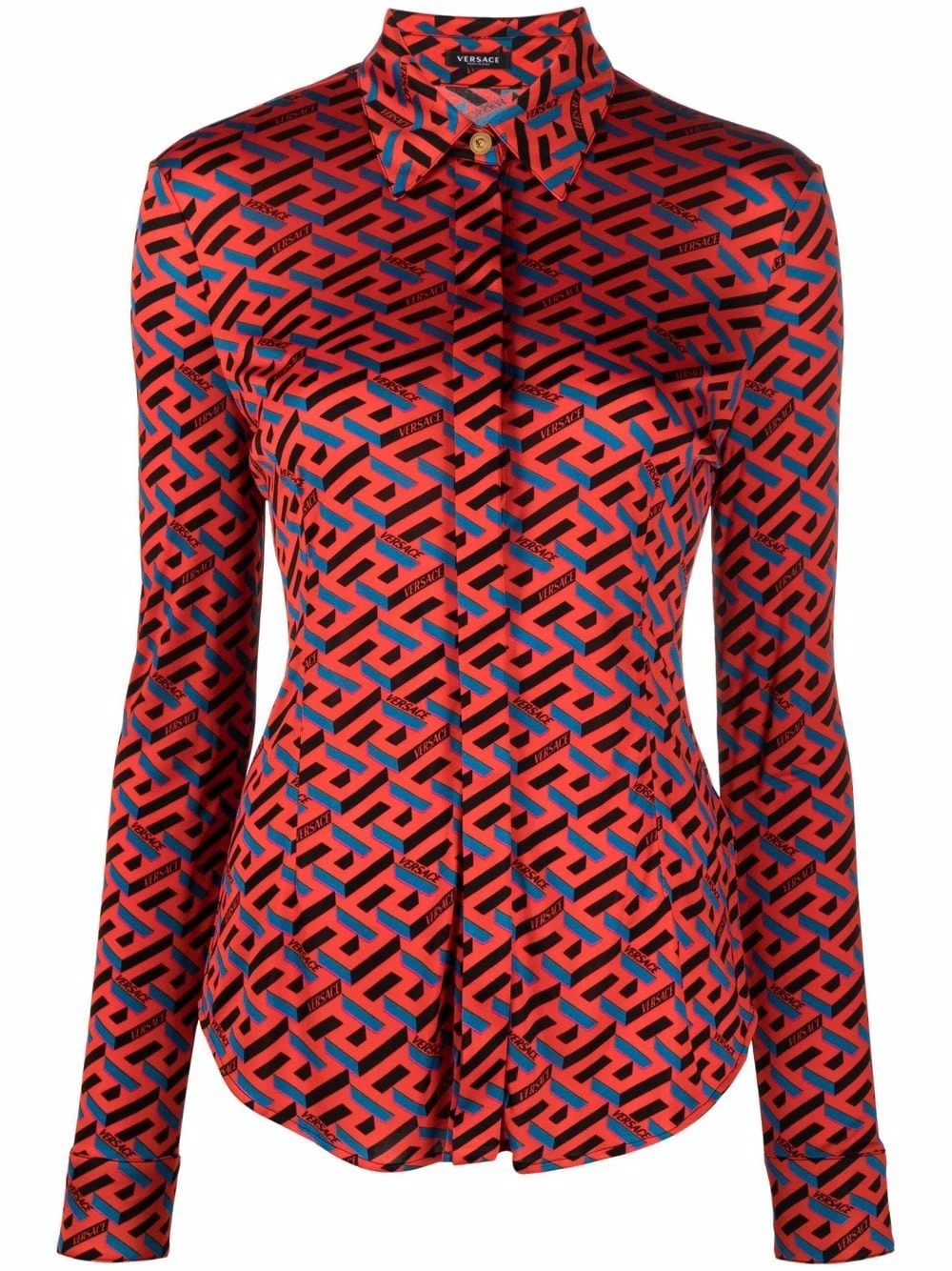 Motif Greca signature imprimé, col pointu, boutonnière sur le devant, ourlet incurvé, manches longues.