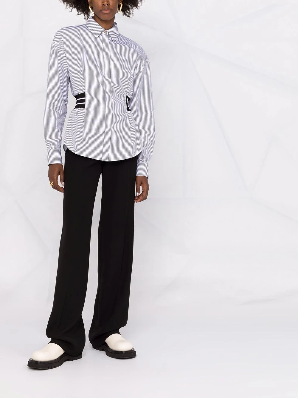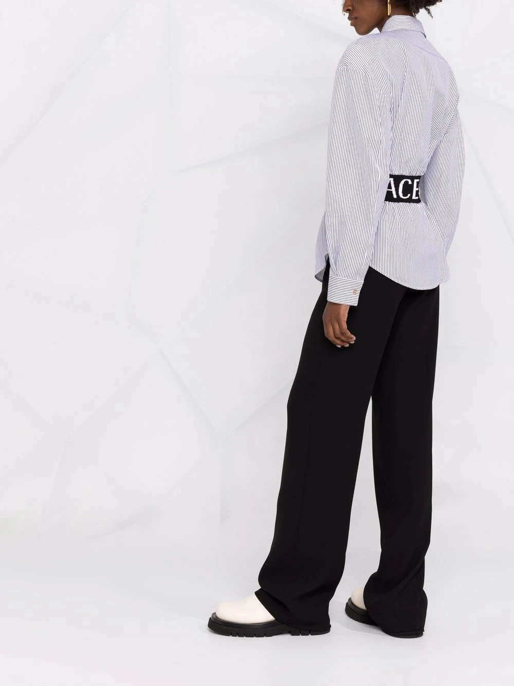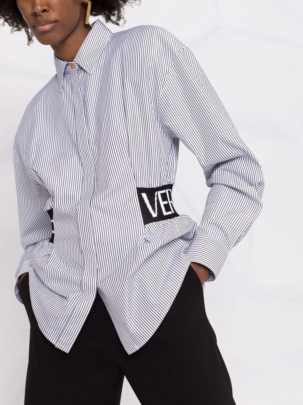 Rayures verticales, logo intarsia, empiècements élastiqués sur les côtés, col pointu, boutonnière sur le devant, manches longues. Matière : coton.