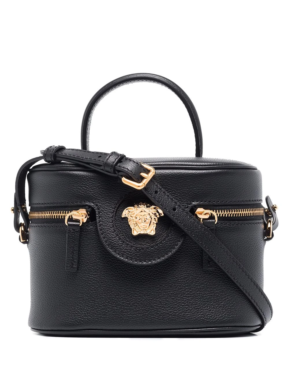 Motif Medusa, finitions en métal doré, bride porté épaule détachable et ajustable, anse arrondie, fermeture zippée tout autour, logo doré, patch logo intérieur. Couleur : noir. Matière : cuir.