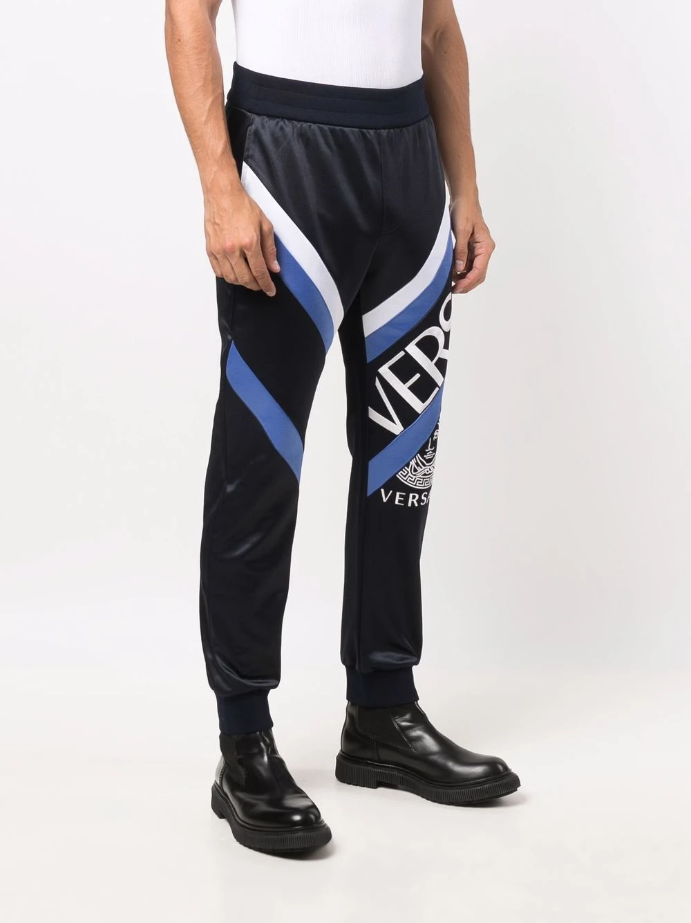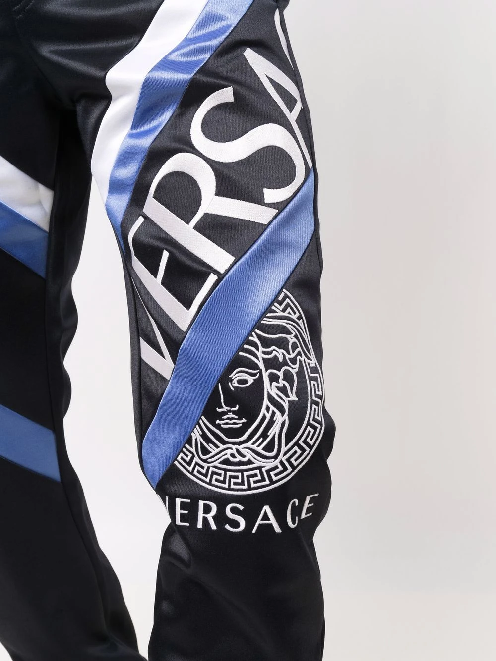 Motif Medusa, logo imprimé sur la cuisse, ceinture élastique, poches latérales fendues. Matière : coton mélangé.